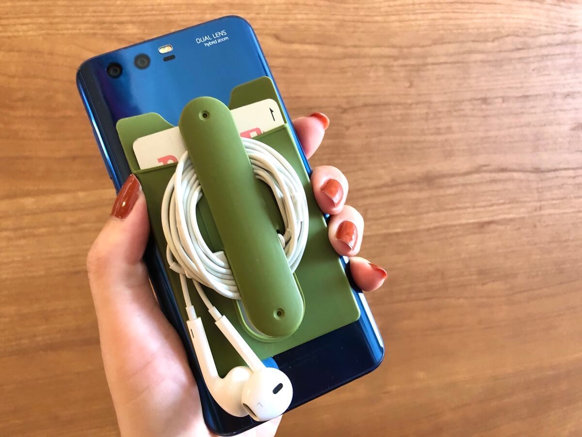 実はこのシリコンシリーズ、スマホバージョンもあります。 スマホ本体にシールで貼るだけのお手軽さなのですが、このようにカードが入れられて、イヤホンもコンパクトに収納できます。