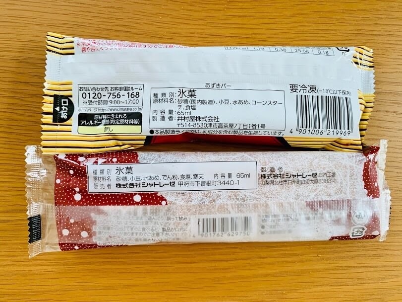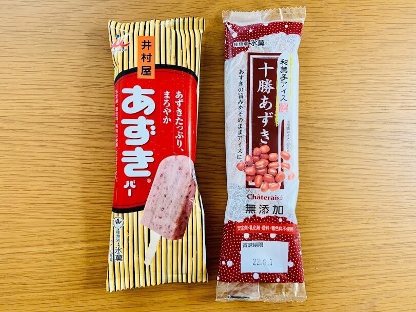 どちらも硬めですが、シャトレーゼの方が若干柔らかめかな!?という印象と、シャトレーゼの方が甘いです。カロリーが50kcalくらい違うので(シャトレーゼの方が高いです)、井村屋の方があずき本来の味を活かしている感じがしました。