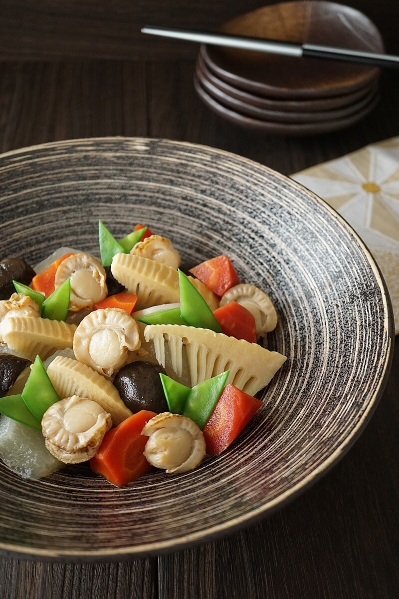 この日は筍・人参・大根・しいたけ・ベビーホタテで作りましたが、ほかにもこんにゃく、ごぼう、レンコンなどを入れて作ることが多いです。
