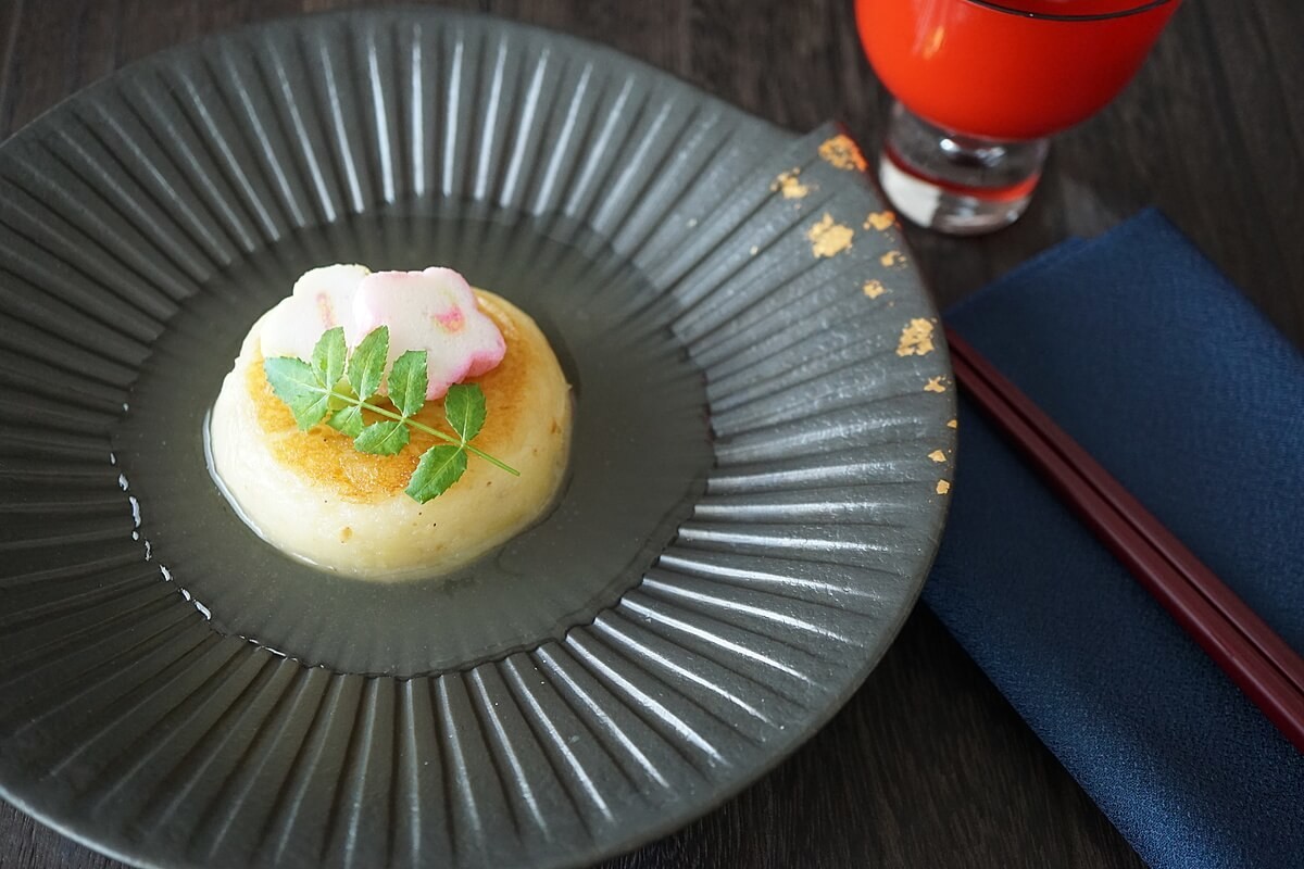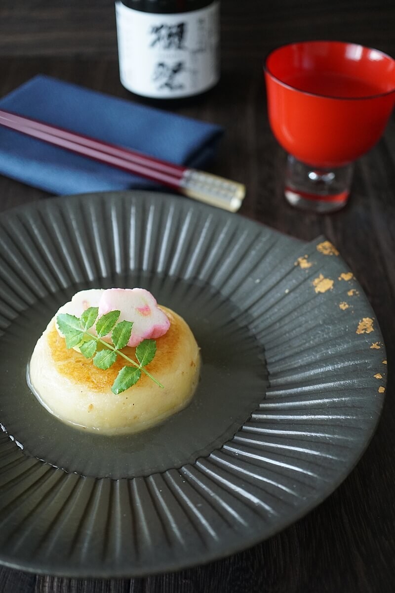 焼きあがったいももちをお皿に盛りつけ、あんかけ出汁をかけて出来上がりです。