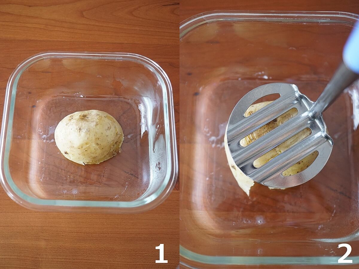 (1) じゃがいもをよく洗い、皮がついたままスチームケースに入れて600Wのレンジで5~6分加熱します。