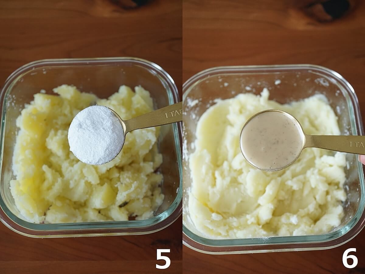 (5) 片栗粉(大さじ2)を混ぜてよくこねます。