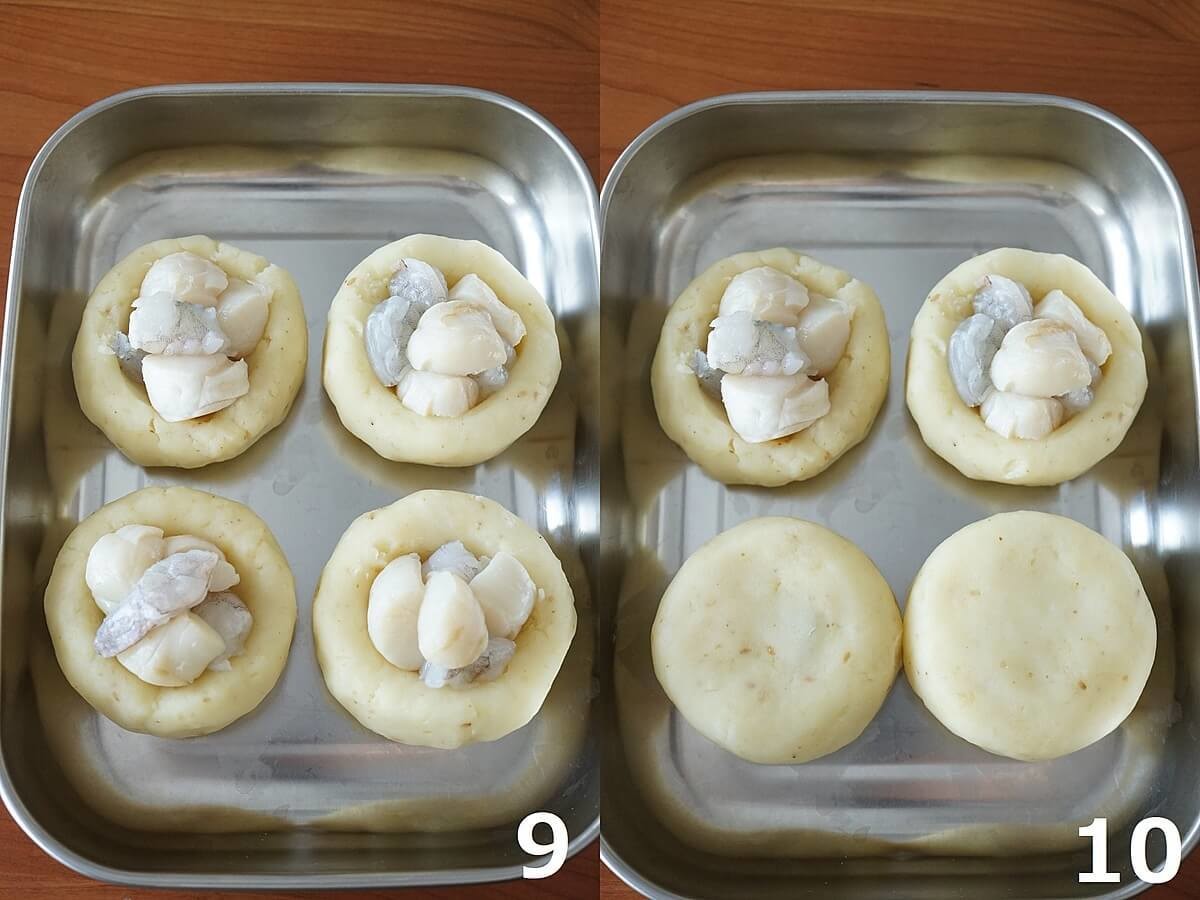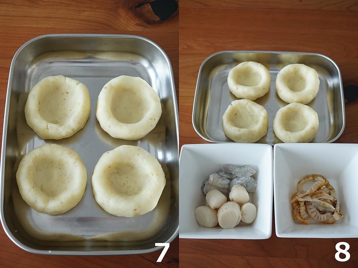 (10) ヘリの部分のじゃがいもを伸ばしながら海老と貝柱を包み、成形します。