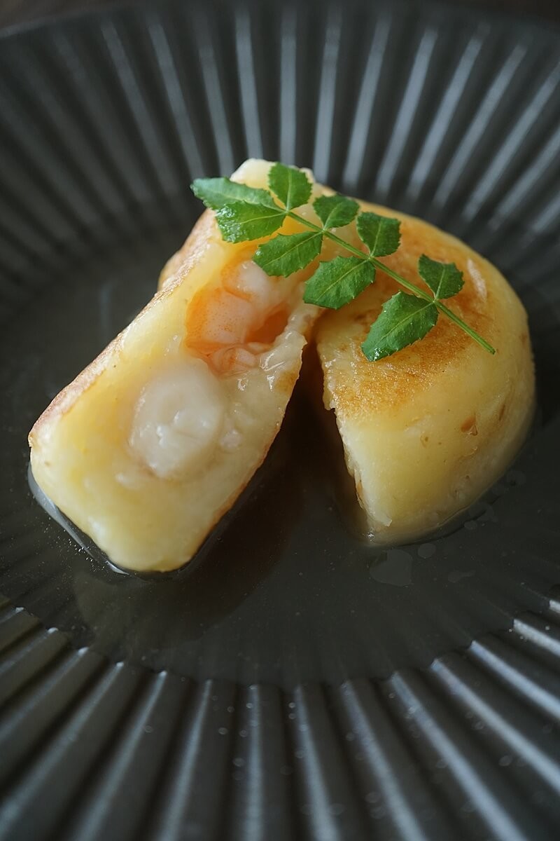 こちらは中にベビーホタテと海老を入れて、あんかけ出汁をかけたアレンジいももちです。