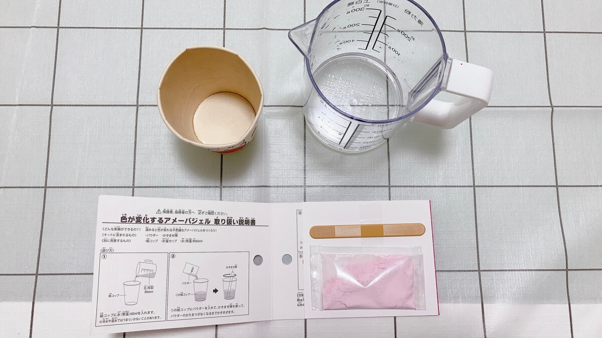 と一瞬身構えてしまいましたが、材料を見てみるとこのキット以外に必要な物は水やお湯、ちょっとしたケースくらいで小難しい準備は一切なし。