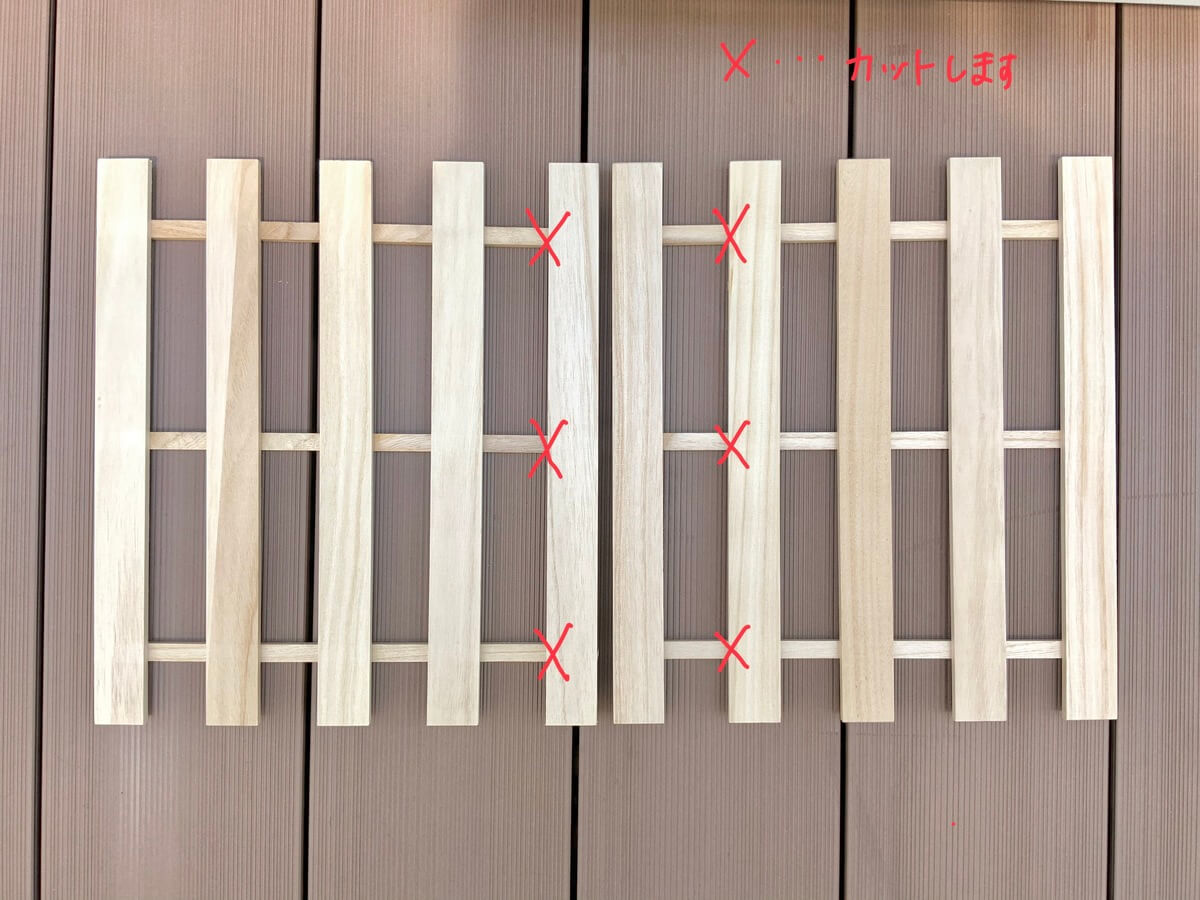 残りの2枚のすのこの、写真の位置をノコギリでカットします。