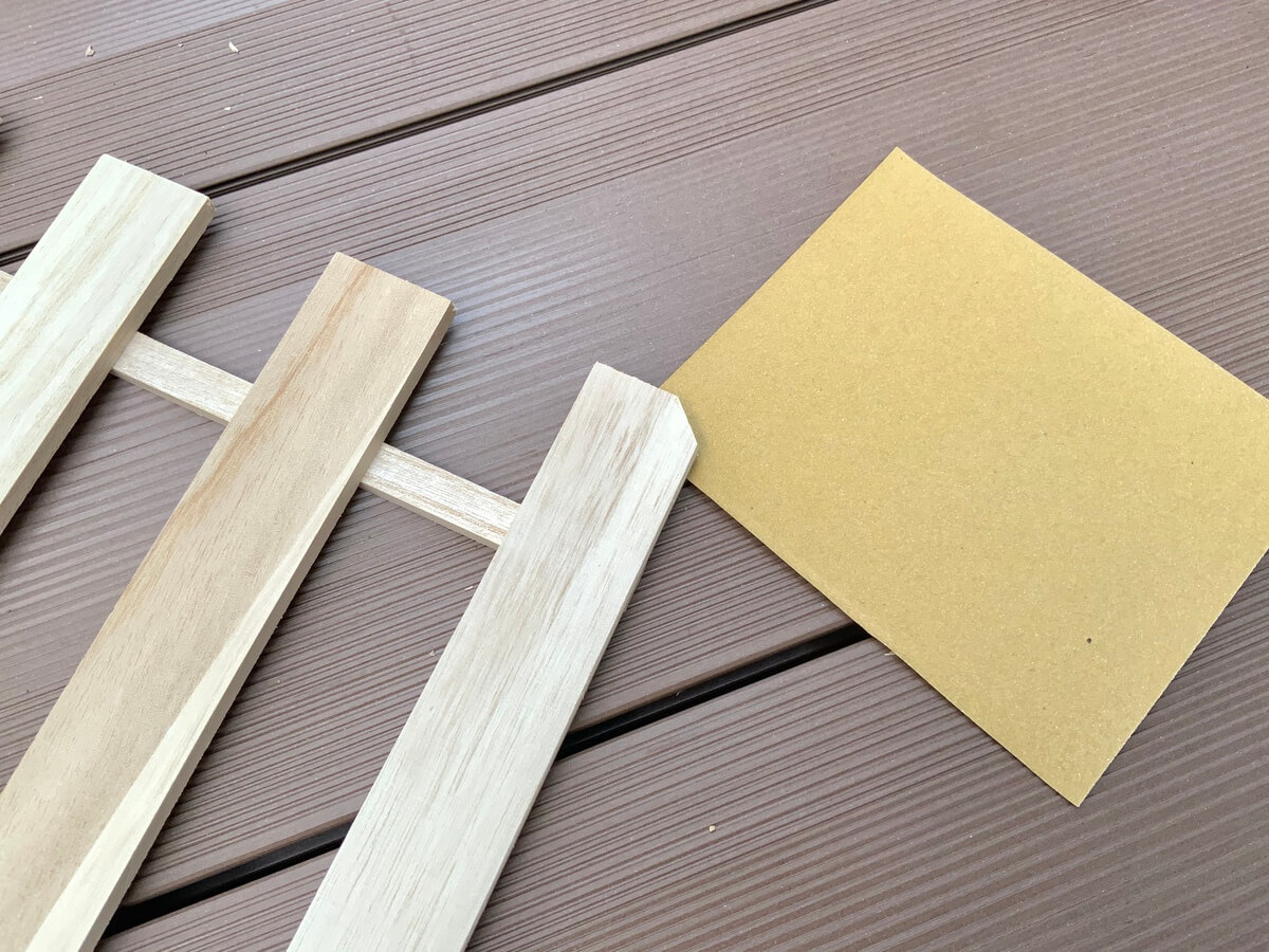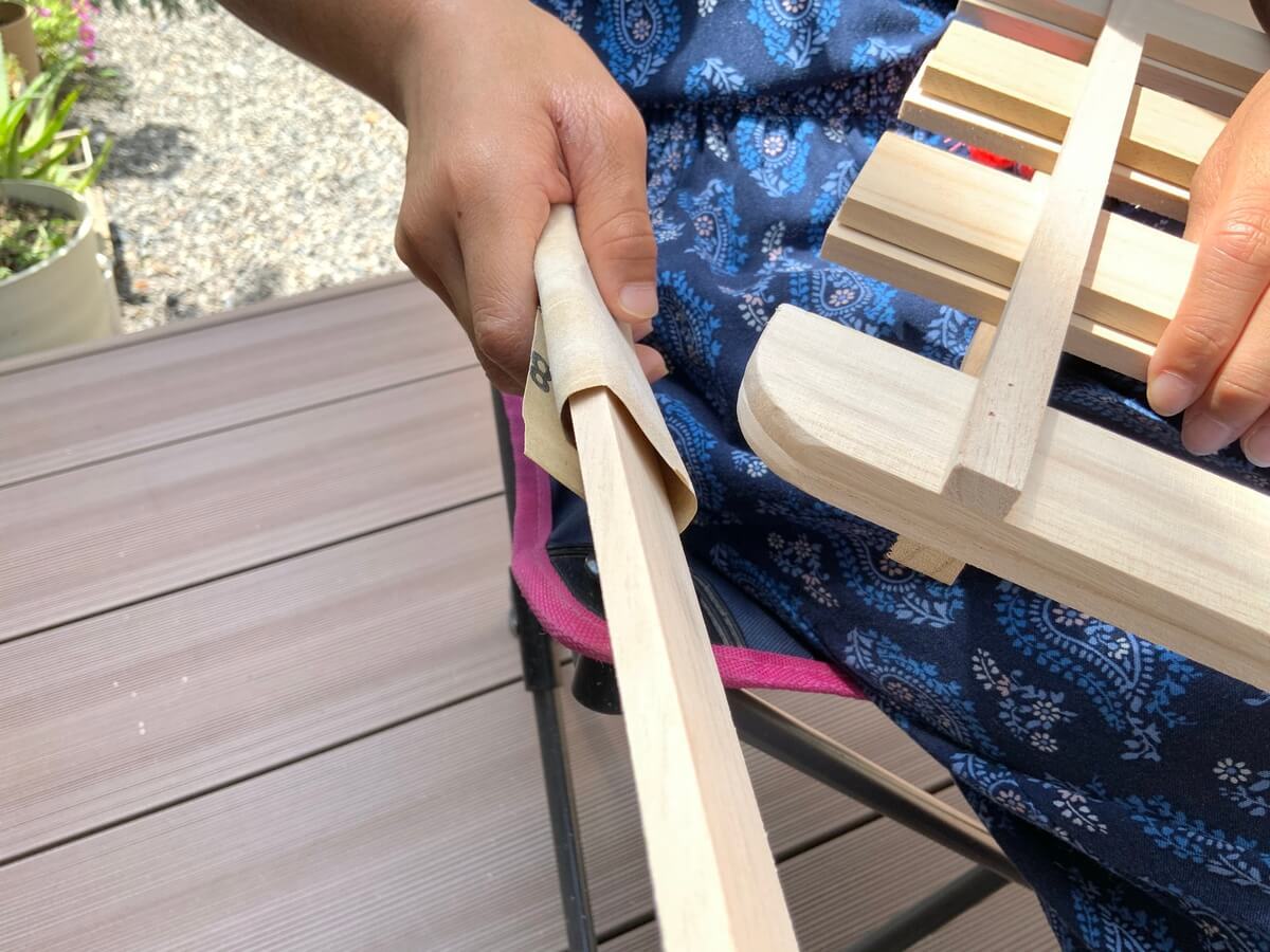 ノコギリでカットした(2)のすのこの隙間に、分解した(1)の木材をはめ込み、木工用ボンドで接着します。