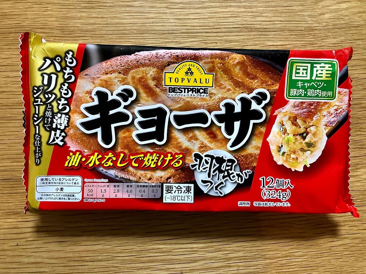 いろいろな冷凍餃子を試しましたが、「トップバリュベストプライス」の【ギョーザ】(本体価格158円)は画期的で、感動しました。フライパンで作る冷凍餃子ですが、油はともかく、【水さえも使わない】で羽根つき餃子が12個できるんです。