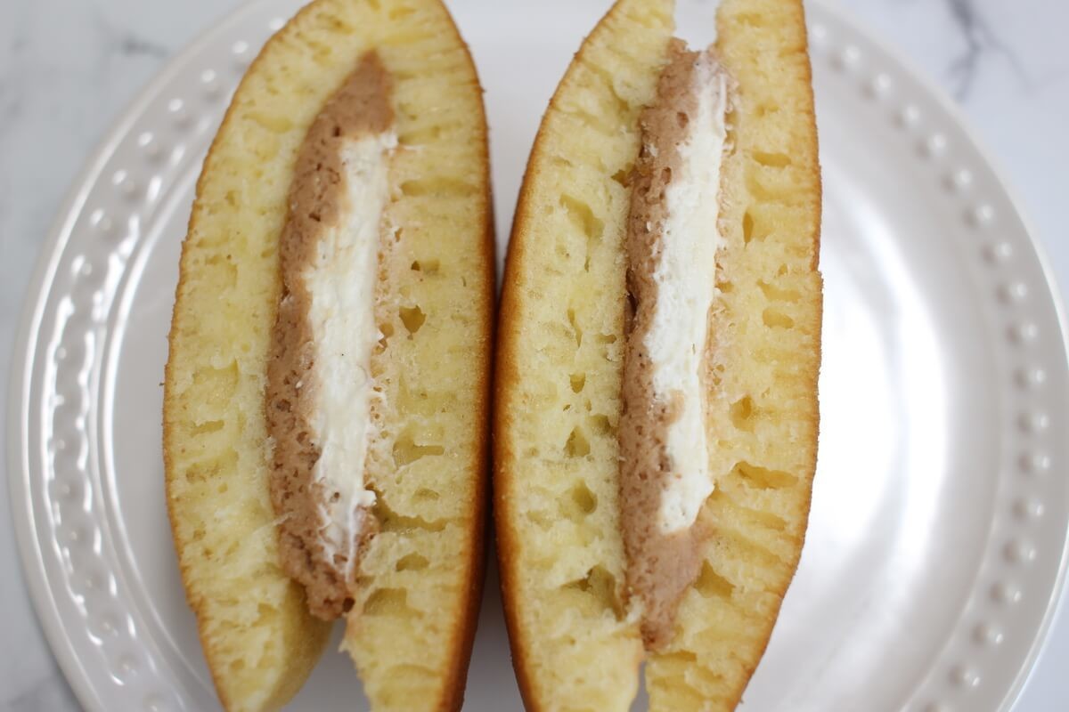 切ってみると、パッケージの写真のように下部にさつまいもクリームがあります。 クリームはとろとろと柔らかくこぼれ落ちそうに。