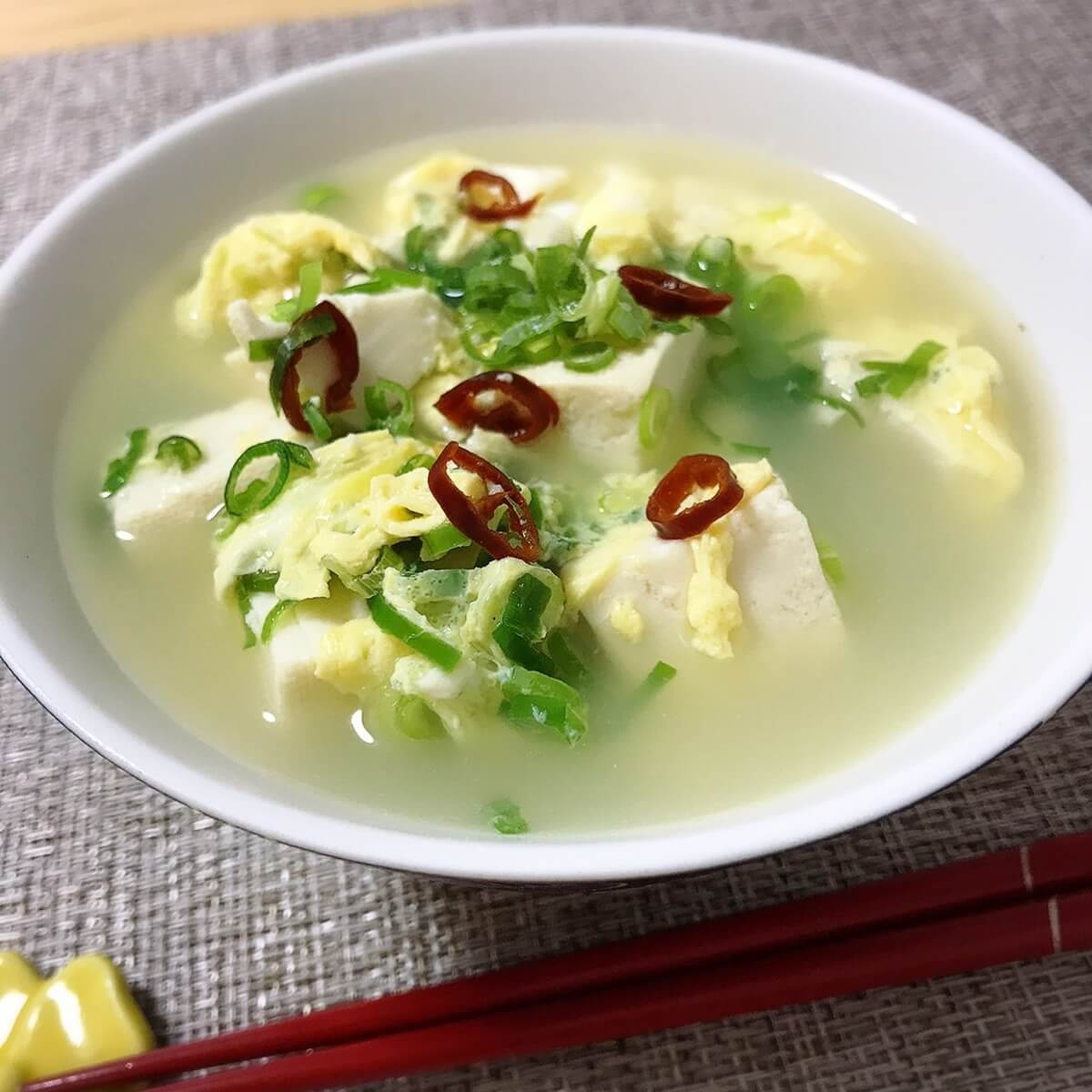 1.唐辛子で脂肪燃焼!豆腐とふわふわ卵のピリ辛スープ