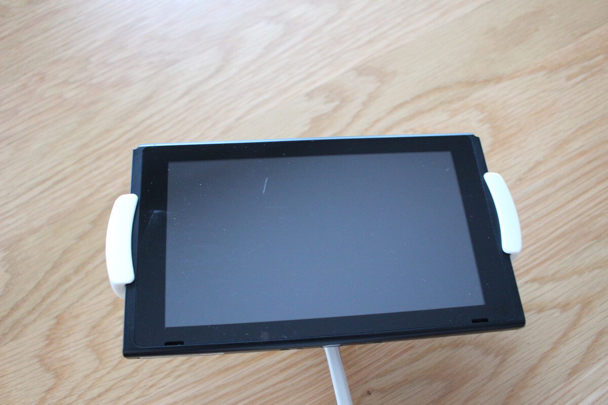 そんなときは、ホルダーの出番! ホルダーにゲーム機をつけて椅子に座って遊んでもらいます。手に持つよりも良い姿勢をキープでき、落としてしまう心配もありません。