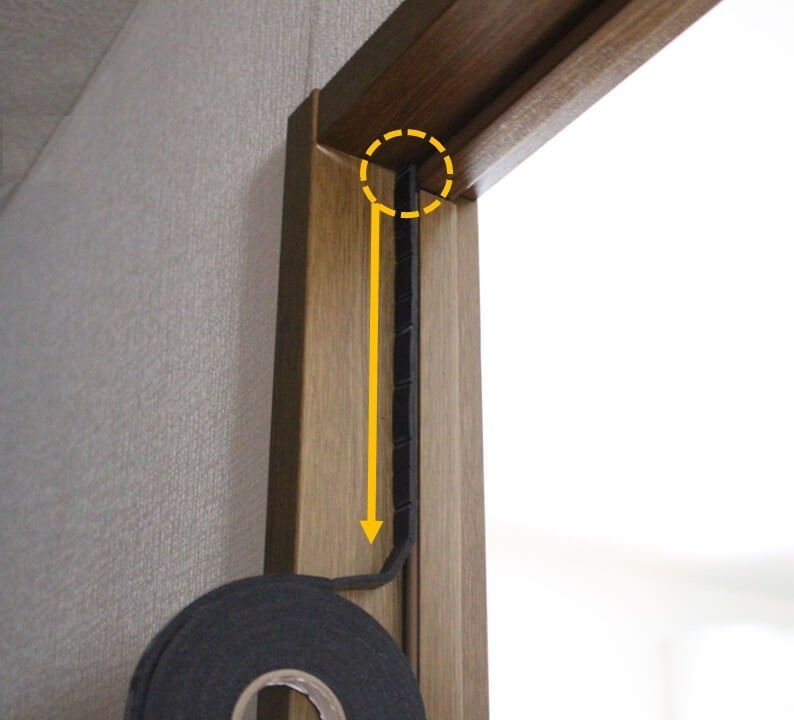 必要に応じて建具を保護した上で、ドア枠の縦・横方向に貼っていきます。