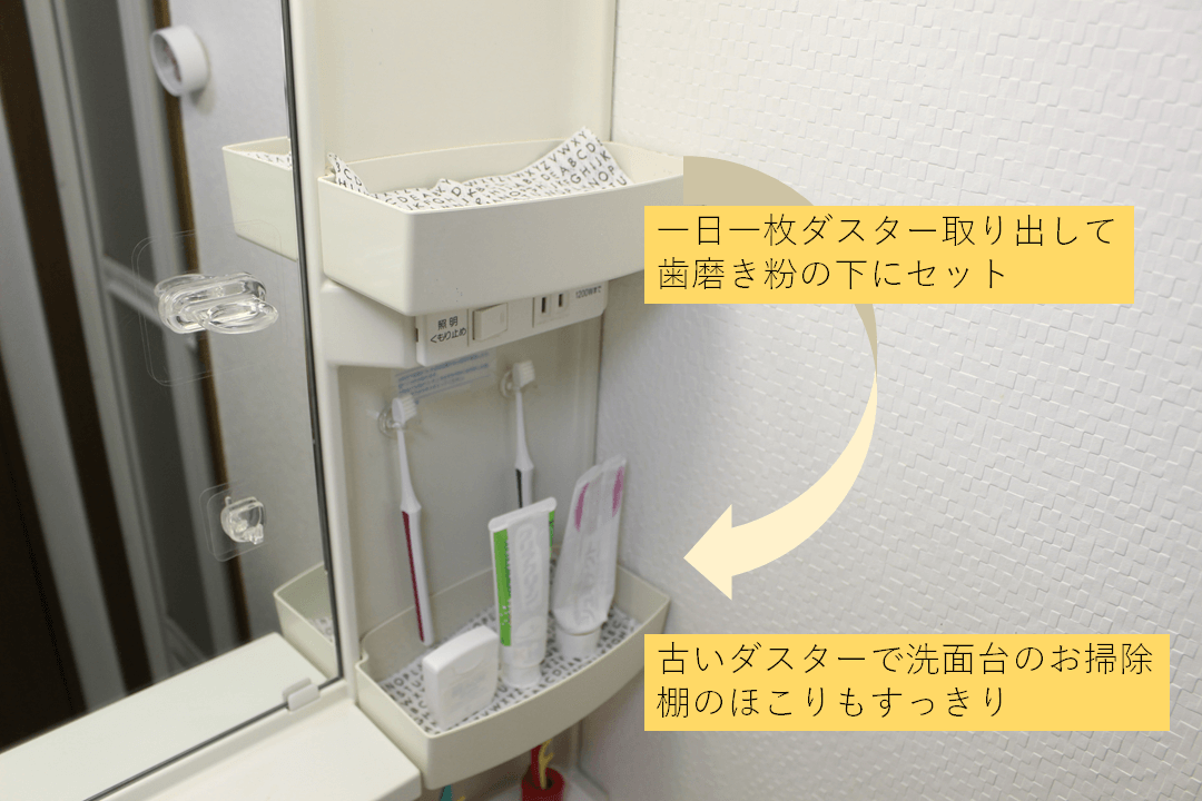 まずはダスター棚の下の階で、歯ブラシ類の水気取りとして働いていただいた上で、次の日に新しいダスターと交代。そのタイミングで古いダスターには掃除(ほこり・水回り掃除)をしてもらうという流れ。