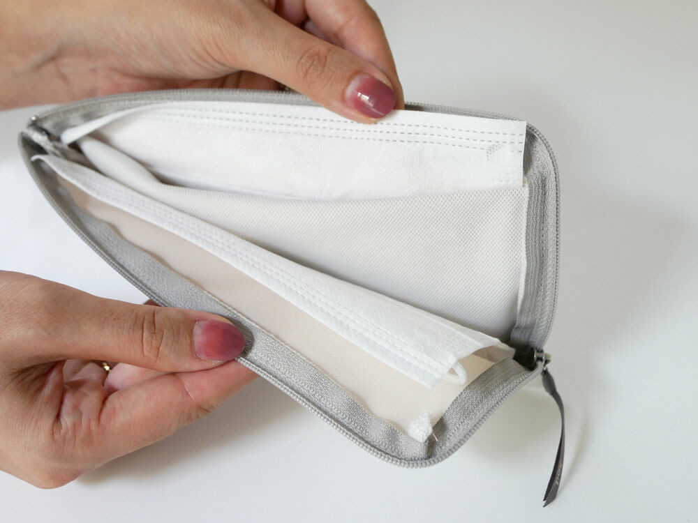 大きく開くL字ファスナーがマスクが引っかかることなくスムーズに出し入れできます。