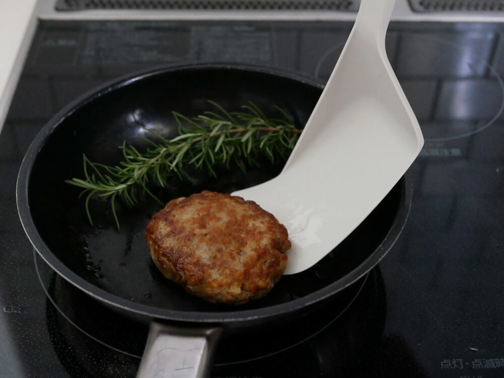 ハンバーグなど食材の下にスムーズに入り込むよう、絶妙なしなり具合を実現しました。