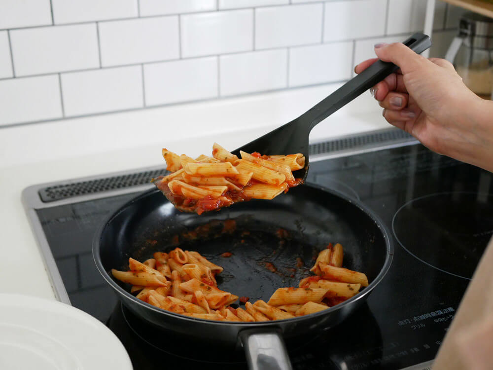 フライパンの曲面に沿った形状で、サイドに壁があるため料理を一気にすくえます。柔らかい素材なので、ソース類なども隅々まで残さずかき集めることが出来ますよ。