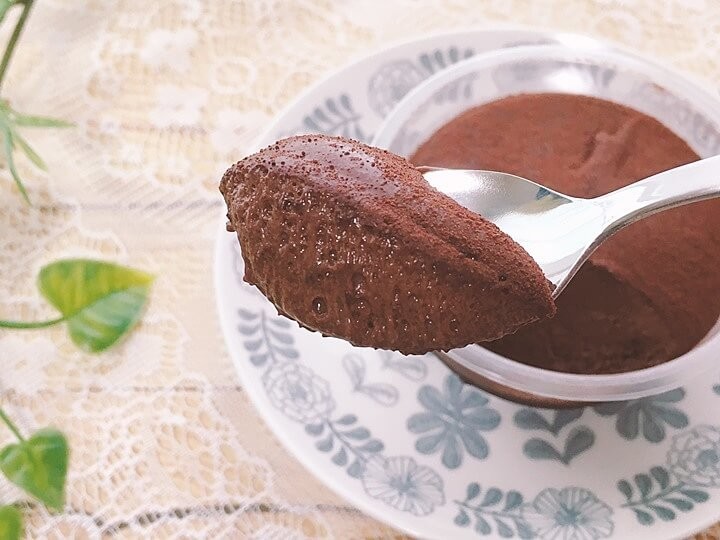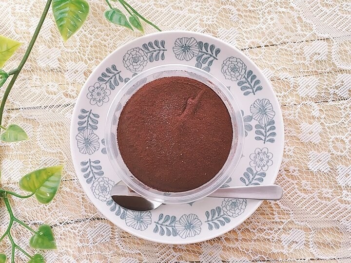 季節や解凍時間にもよりますが、このときはココアパウダーの上にほんの少し氷が残っていました。冷蔵室ではなく室温に置いてみてもいいかもしれません。
