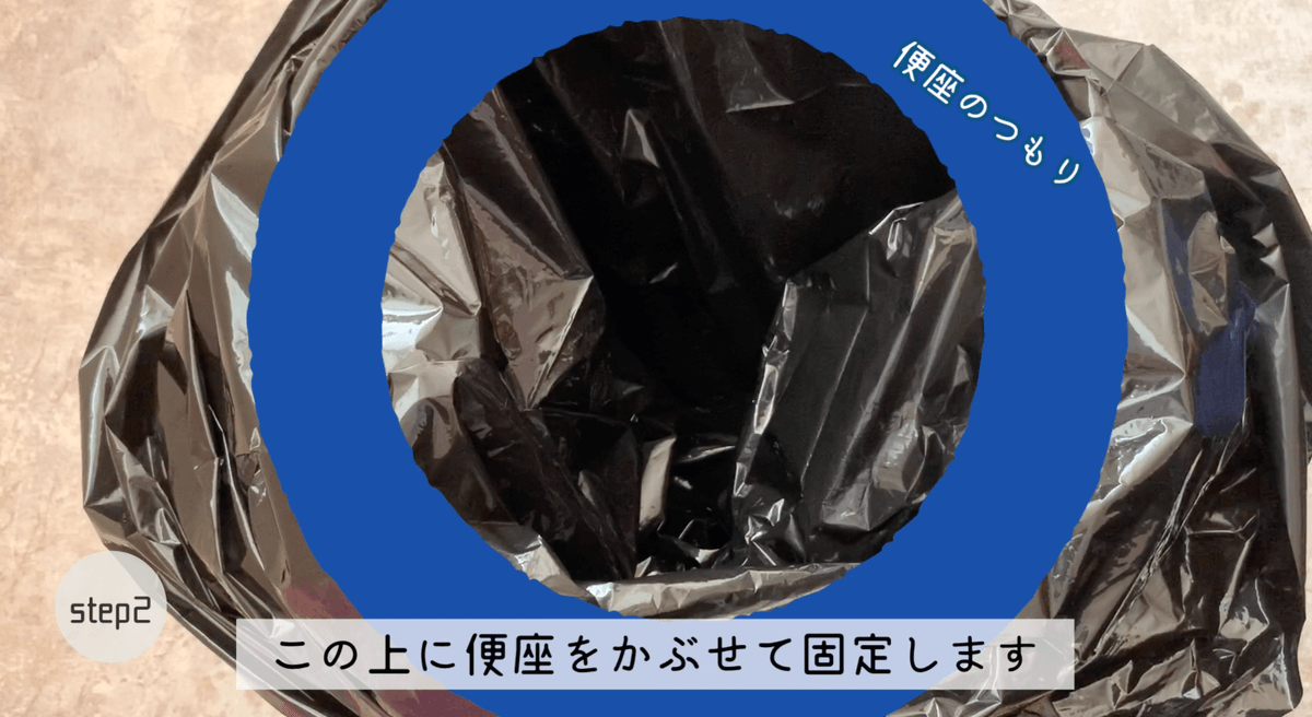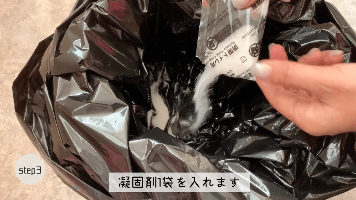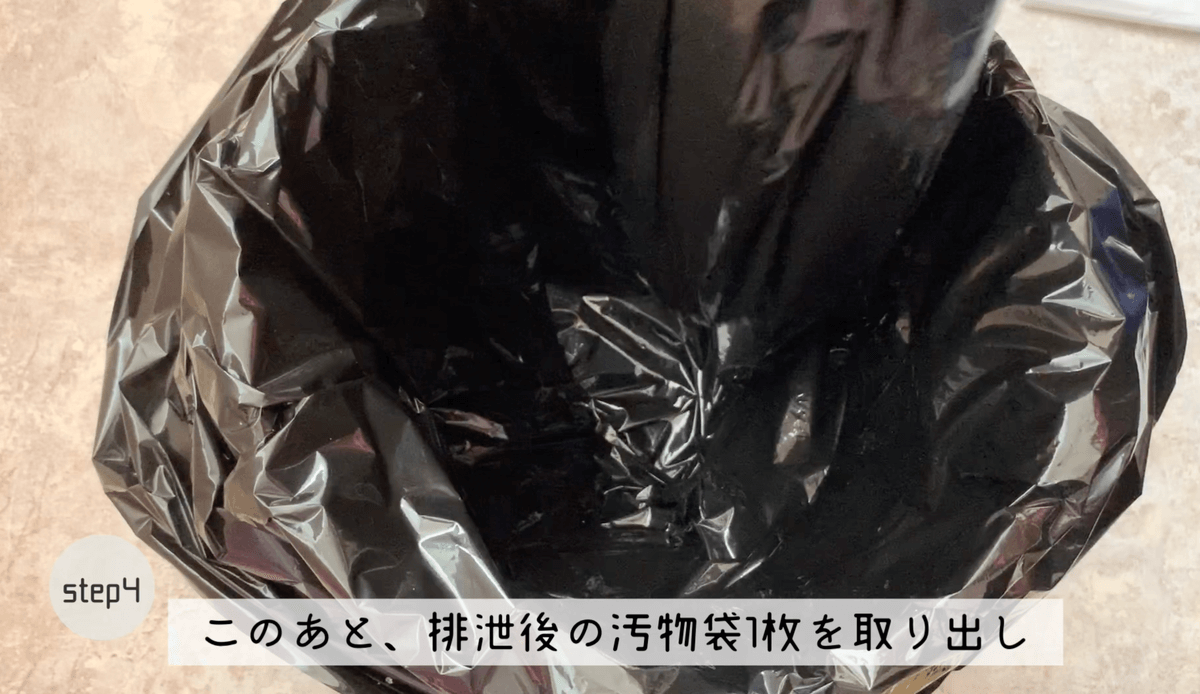 排泄後、凝固剤が固まったら、汚物袋1枚を取り出して口をしっかり結ぶ