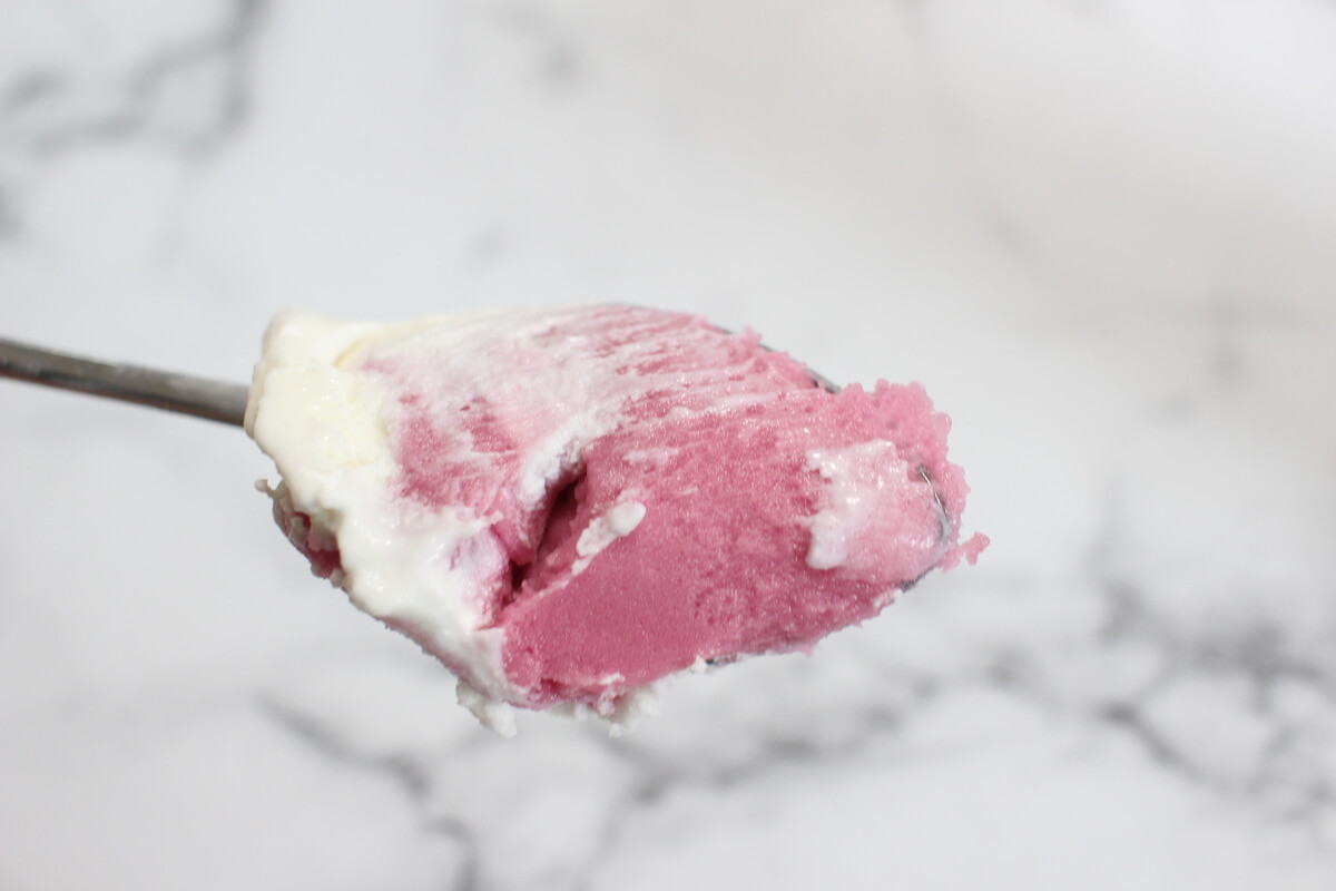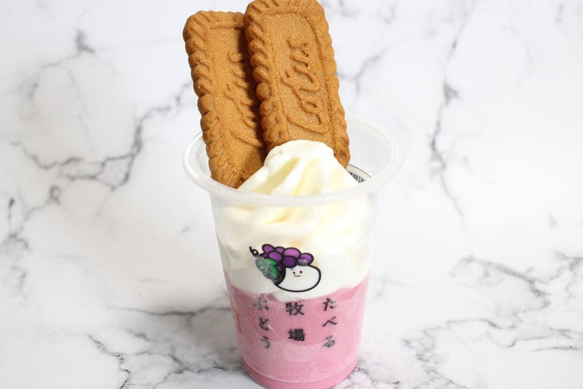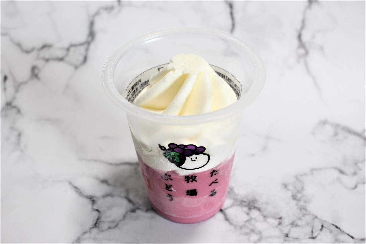 下にはぶどう果汁を使用した濃厚なぶどうジェラート、上には牛乳50%を使用した「たべる牧場ミルク」のミルクアイスが乗った、2層のアイスです。