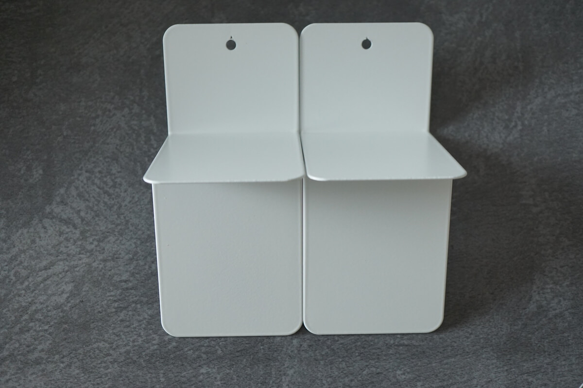 ⑥ブックスタンドミニに貼った両面テープをはがし、珪藻土ソープトレイ(グレー)を2か所に貼り付けます。