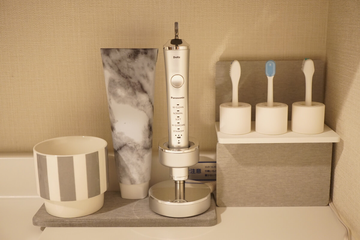 ⑨珪藻土のトレーの上に充電スタンド&電動歯ブラシ本体・歯磨き粉・コップを置きます。
