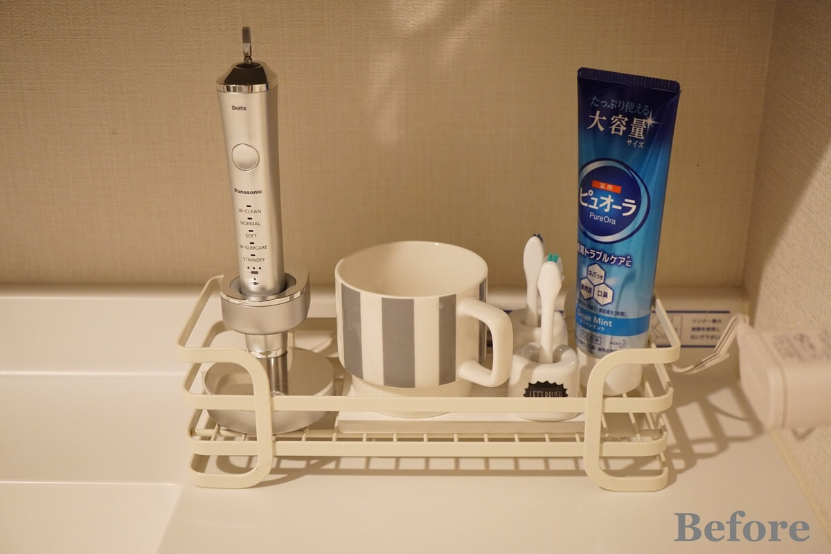 改造前の歯ブラシセット置き場は掃除がしやすいようにラックにのせているだけの状態でした。