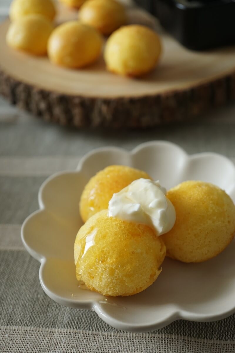マスカルポーネチーズとはちみつをかけたり、チョコシロップをかけたり、生クレームとスプレーチョコをトッピングしたり、一口サイズのホットケーキは焼いた後にトッピングを考えるのも楽しいですよ。