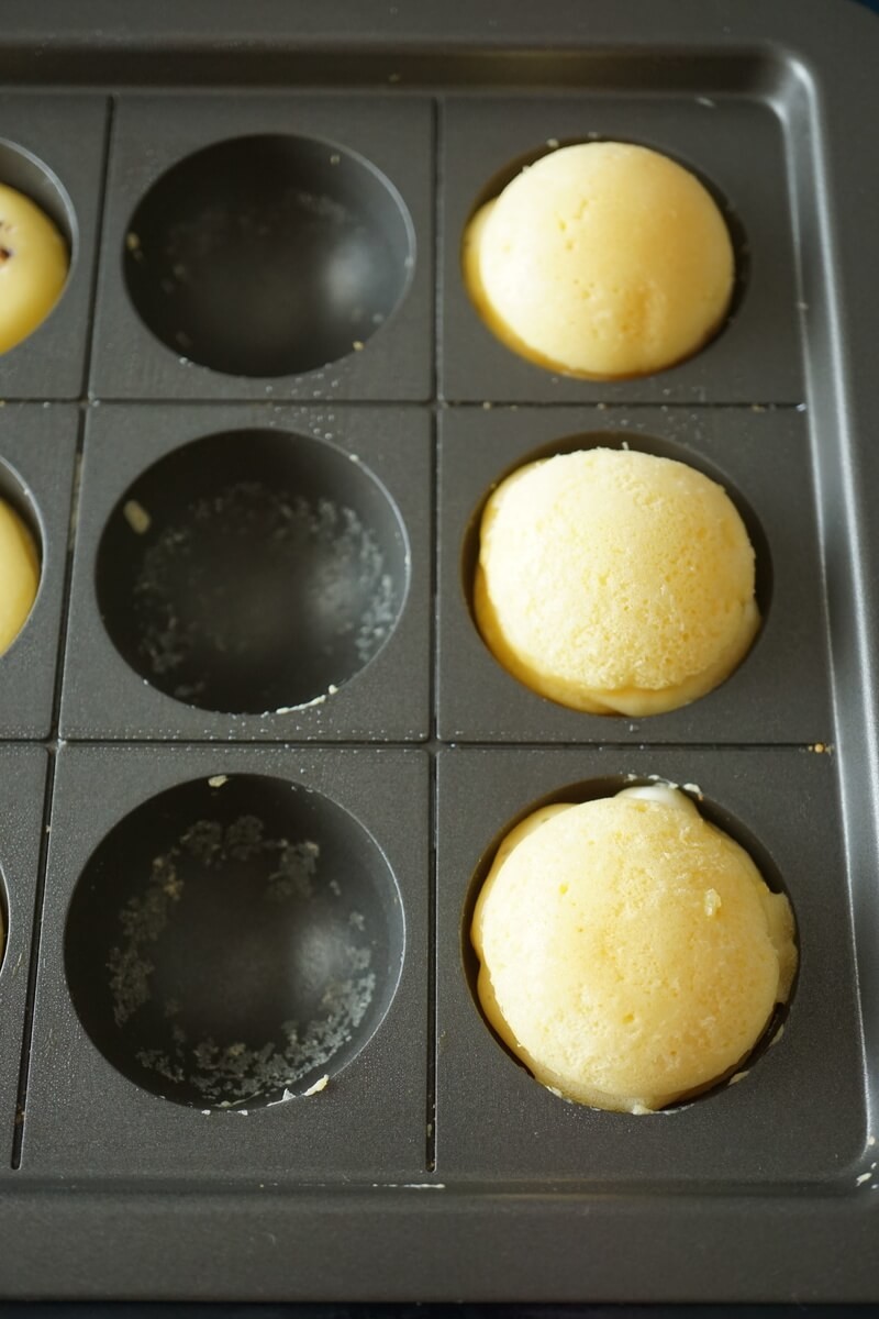 - たこ焼きプレートに1で作った生地を穴の2/3程度まで入れます。