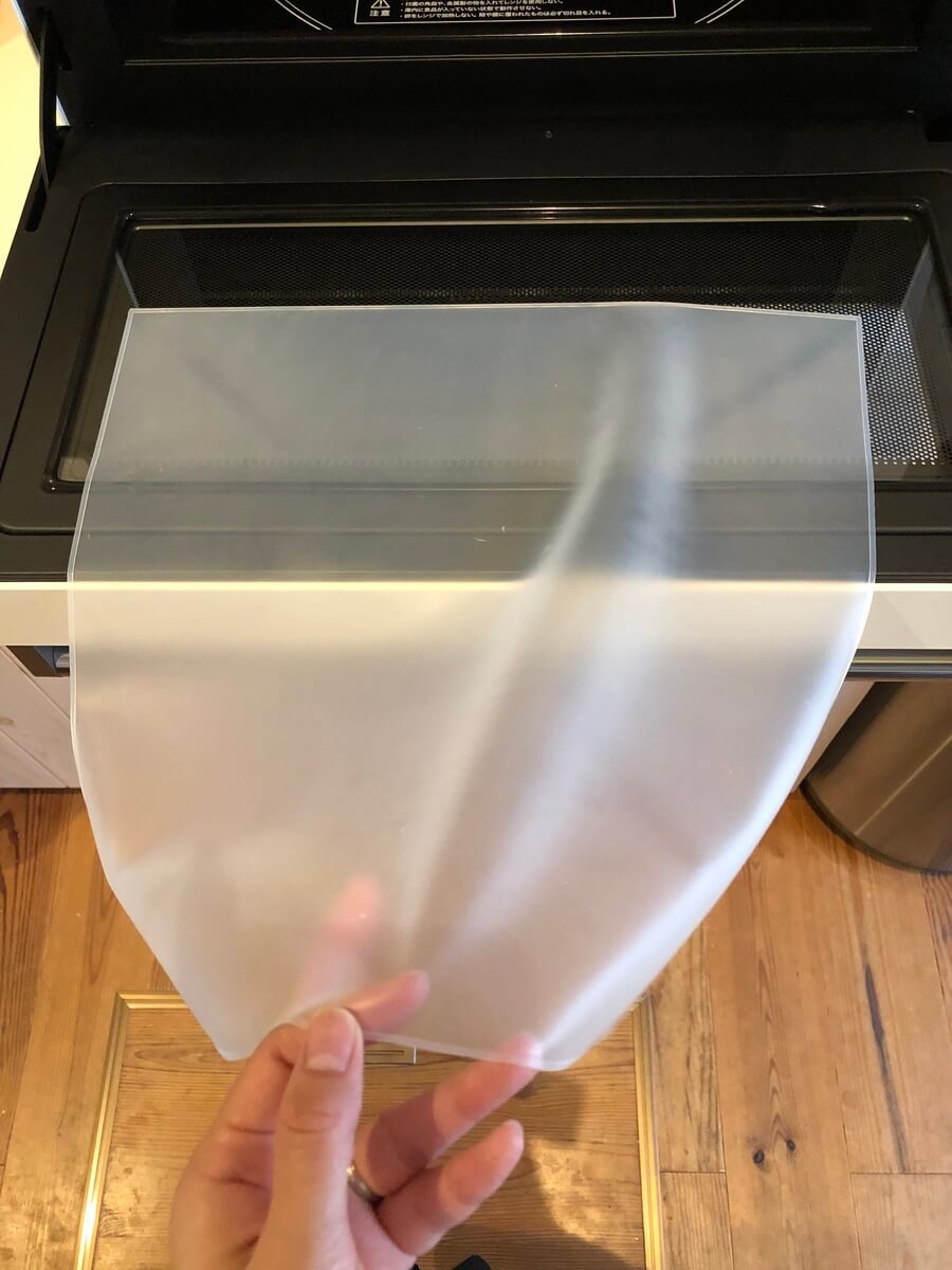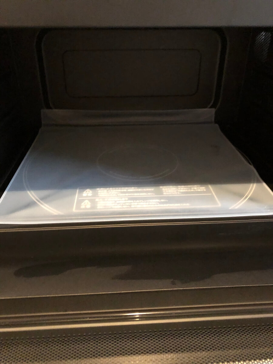 正方形のシートになっていて、我が家のバルミューダの電子レンジに敷くと、若干縦が余ります。