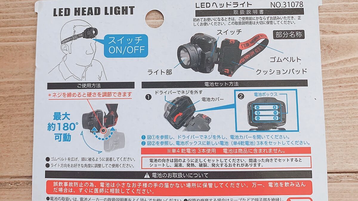 こちらはセリアで税込110円で販売されているLEDヘッドライトです。