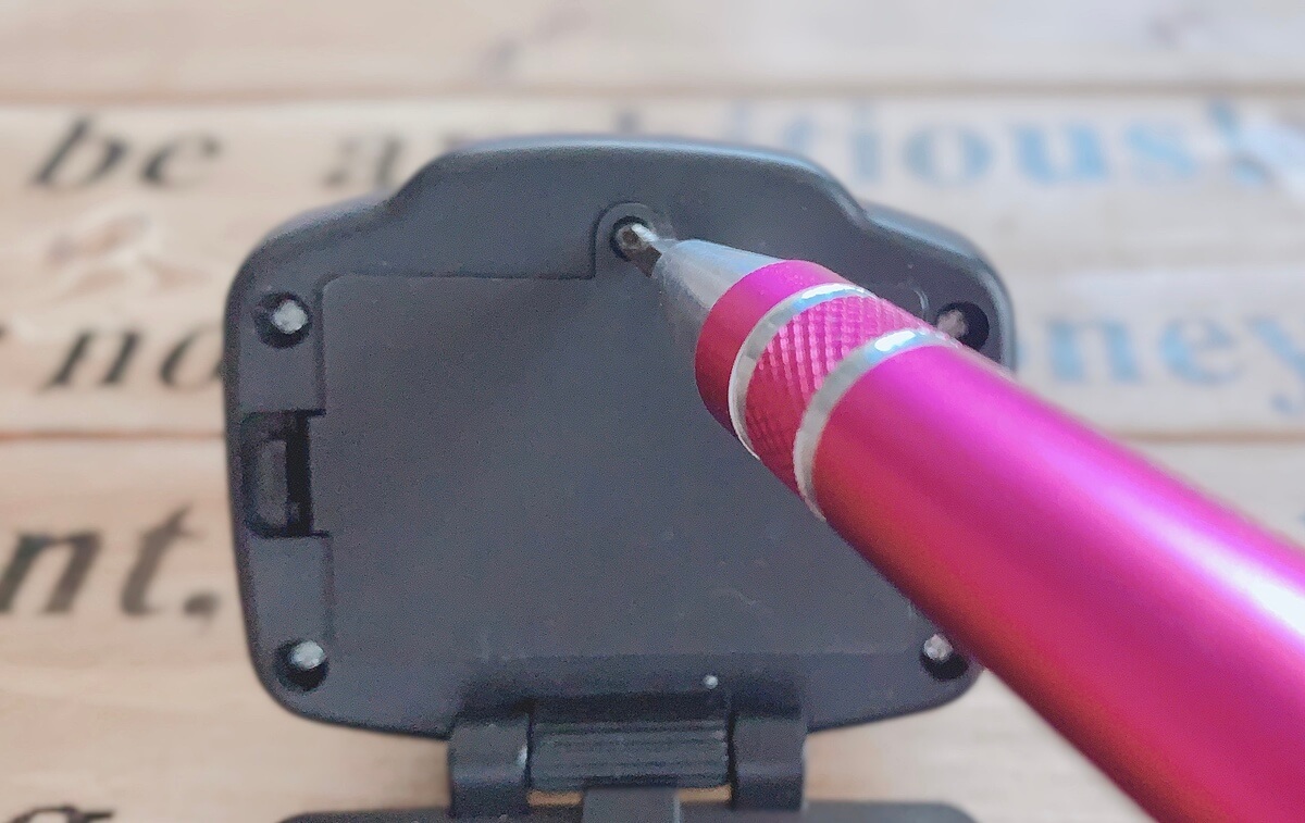 本体の裏側に電池カバーがついていますのでドライバーでネジを外しカバーを開けます。