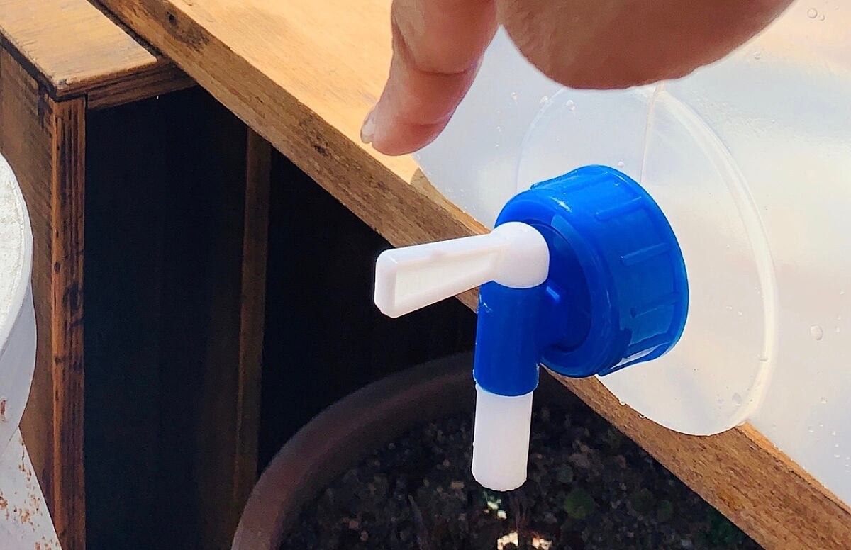 早速、蓋を開けて水を入れてみました。 20Lタンクは立方体ですのでコック(蛇口)を下にして置くことが出来ます。