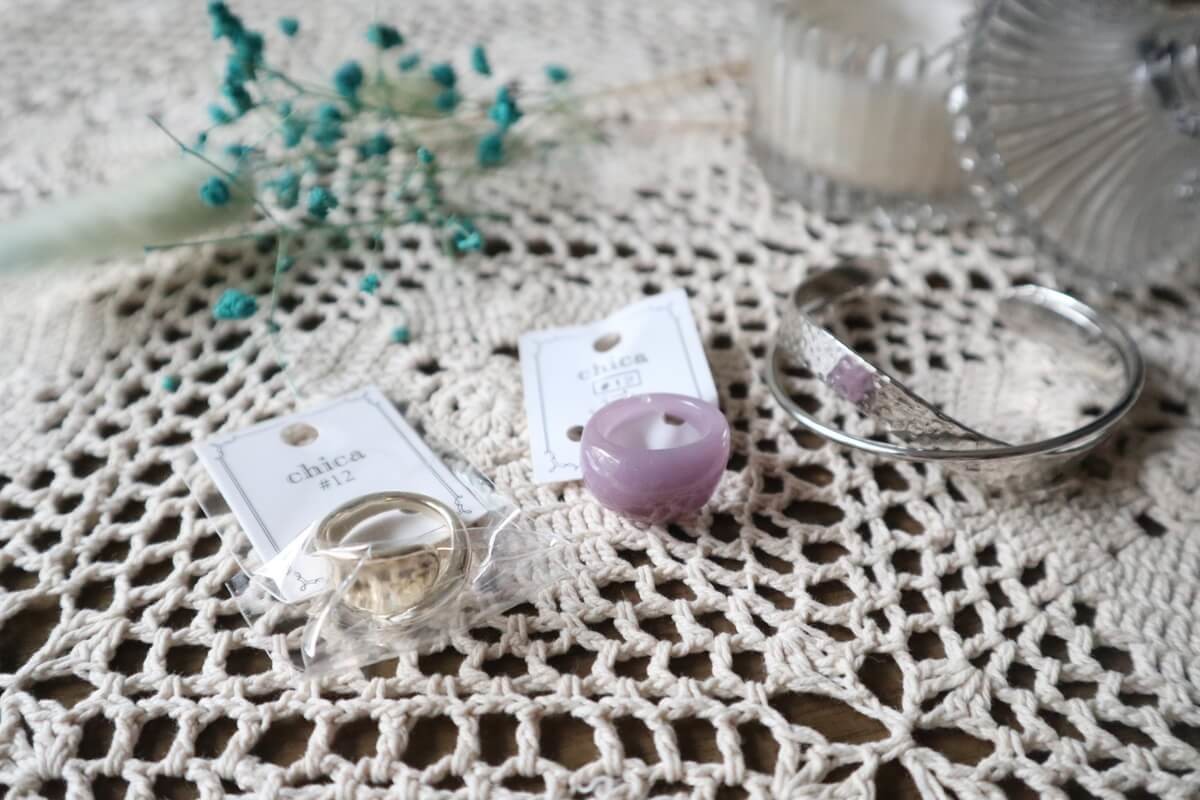右からメタルバングル、カラーマーブルリング、メタルワイドリング各300円。