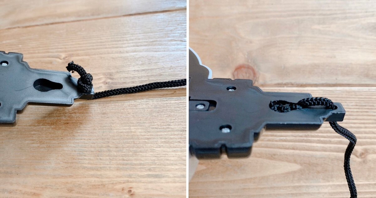 正面側から吊り紐を通し、一度結びます。その結び目をフック穴に入れると結び目が気にならなくなります。
