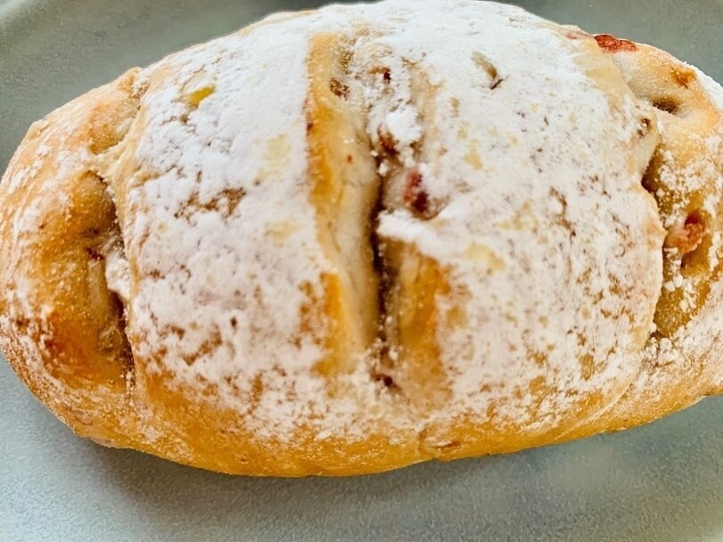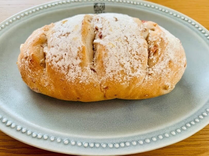 表面に真っ白い粉がかかっていますが、ライ麦粉だそうです。ドライクランベリー・ピーカンナッツ・くるみ・レモンピールが練りこまれています!ナッツとかドライフルーツとか大好き~!
