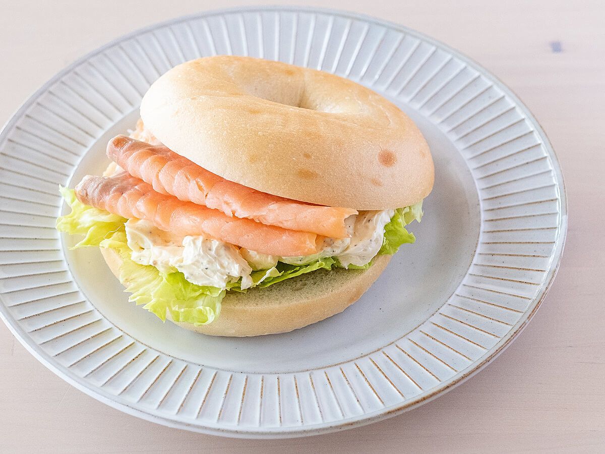 プレーンベーグルを使って、定番のサーモン&クリームチーズのベーグルサンドを作ってみました。