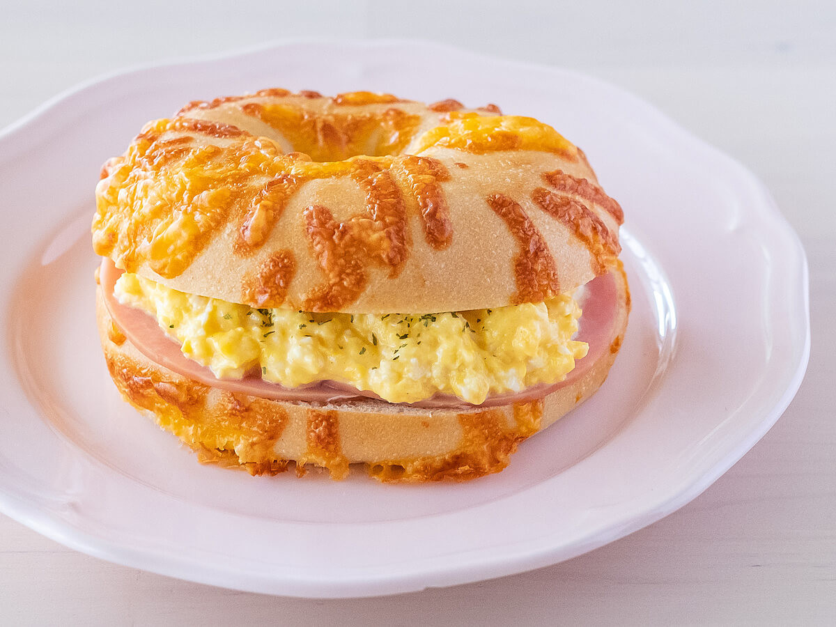 チーズベーグルには、マヨネーズを加えたスクランブルエッグとハムをサンド。