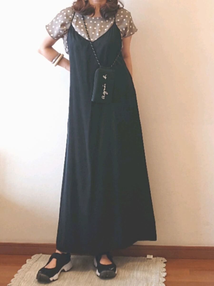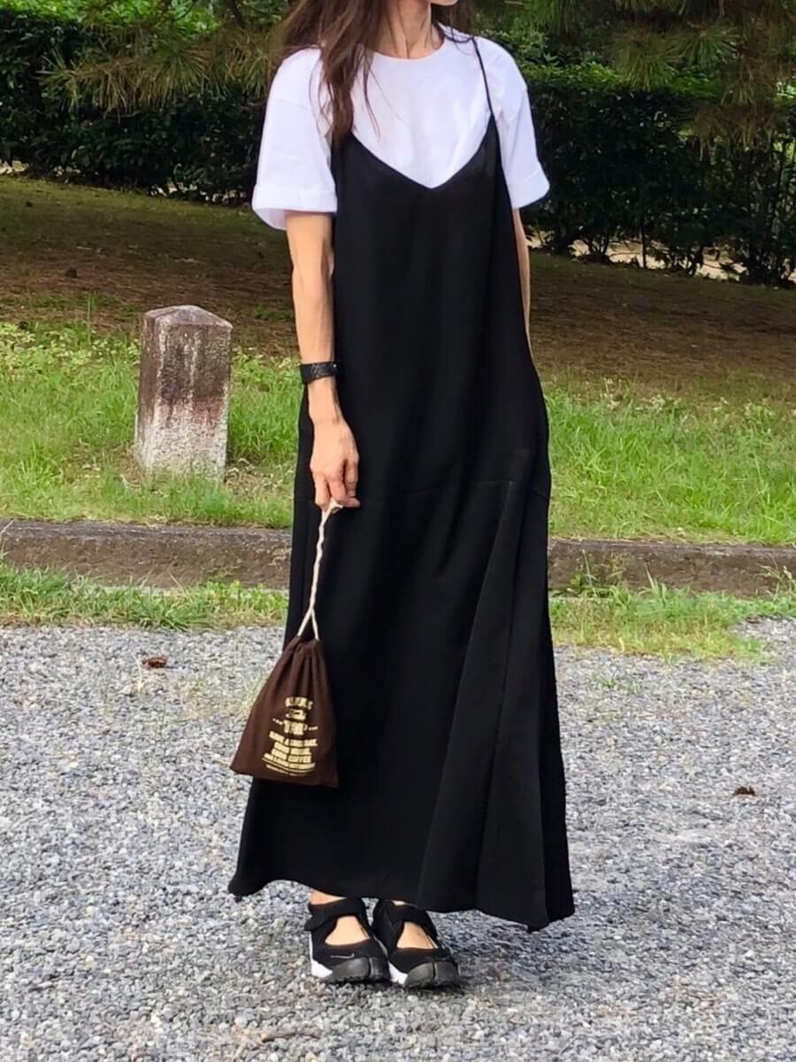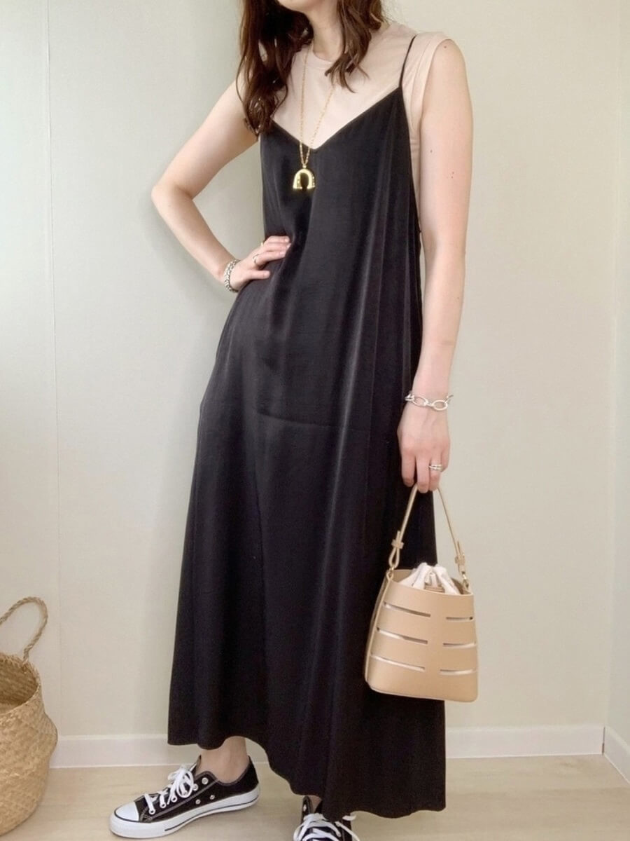 キャミワンピースとカラーリンクさせた、黒コンバースを履いてシルエットに統一感を演出しています。