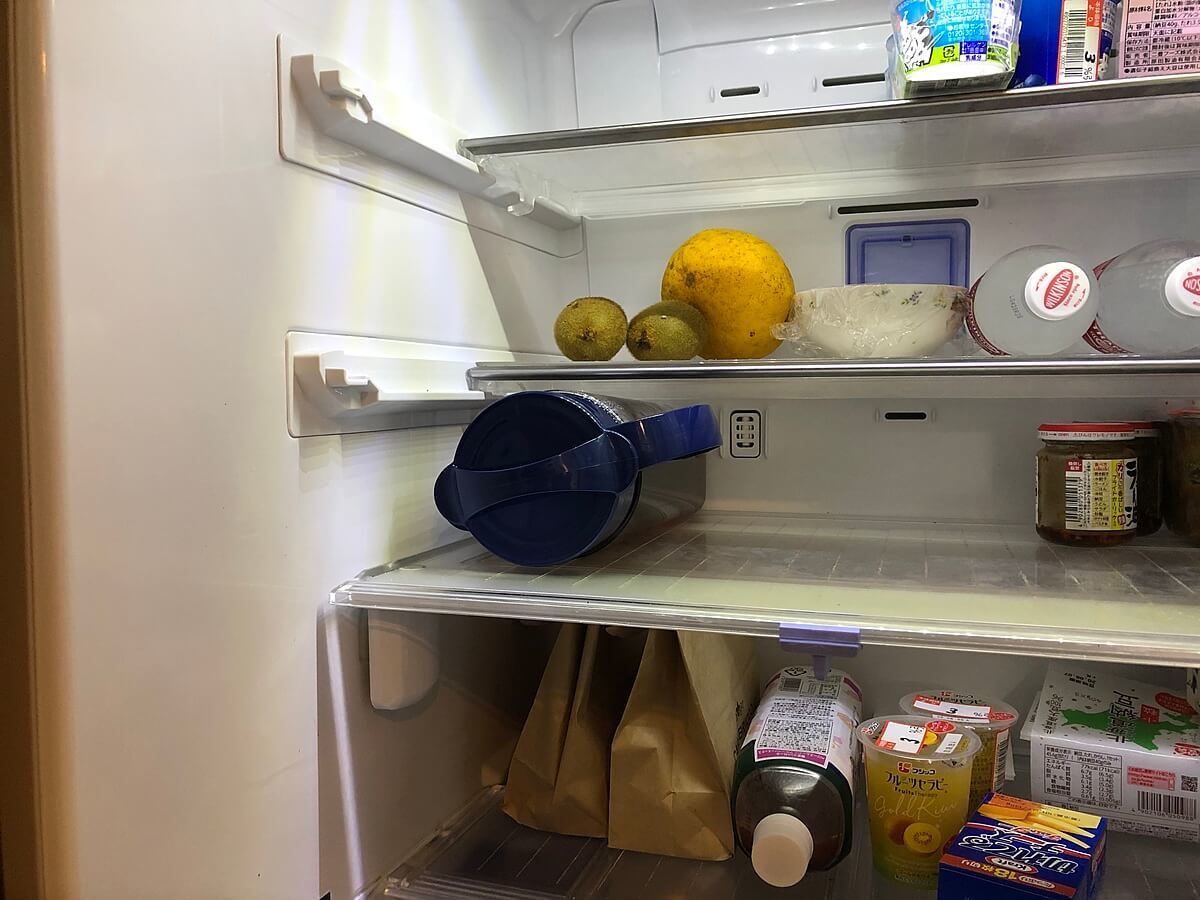 2.1ℓの大容量でも、冷蔵庫のポケットにはすっぽりと入ります。そして画期的なのは、横置きが可能!