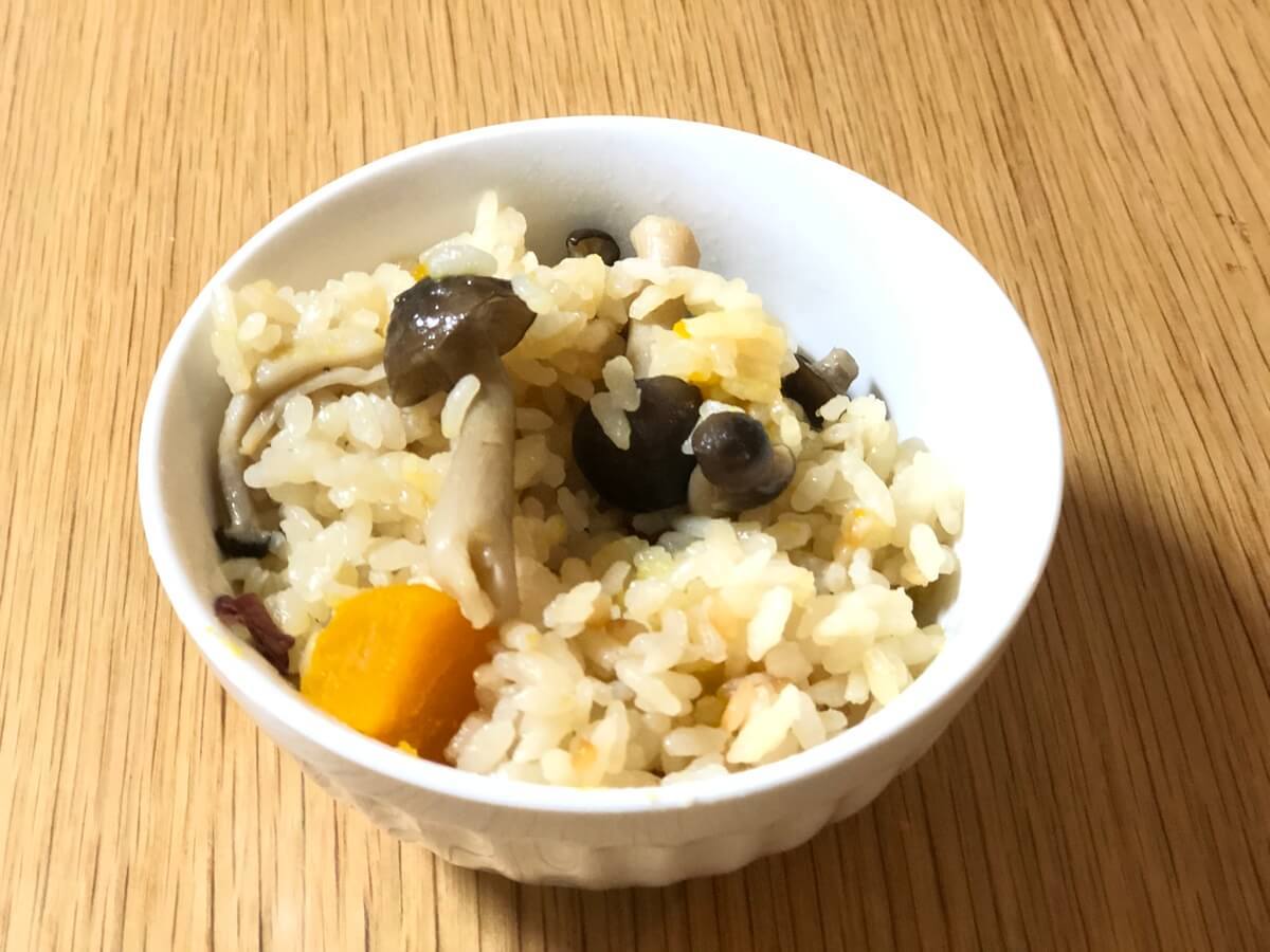 硬いかぼちゃやさつまいもが既にサイコロ切りになっている炊き込みご飯です。