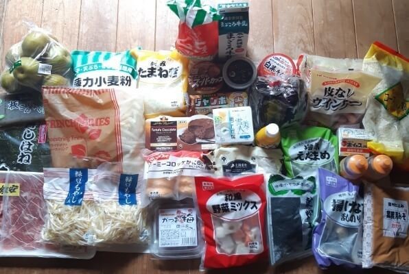 こちらが実際に入れたもの全部です。買い物カゴ1個分は余裕でした。マチがついているから思った以上にたくさん入ります。