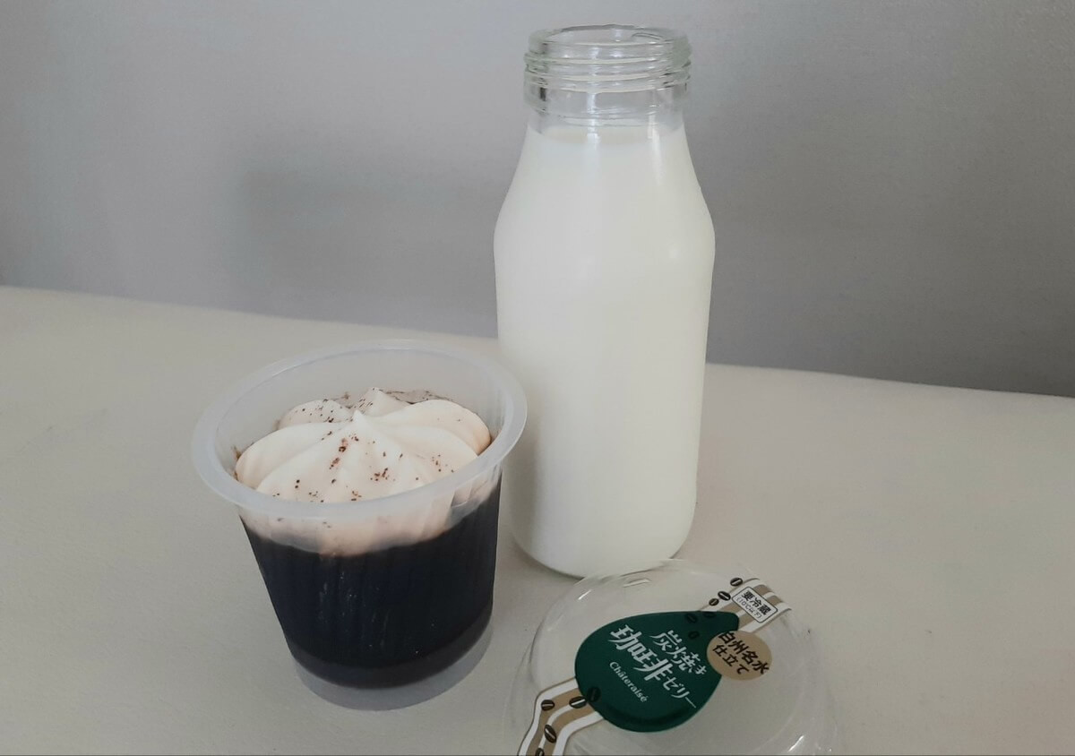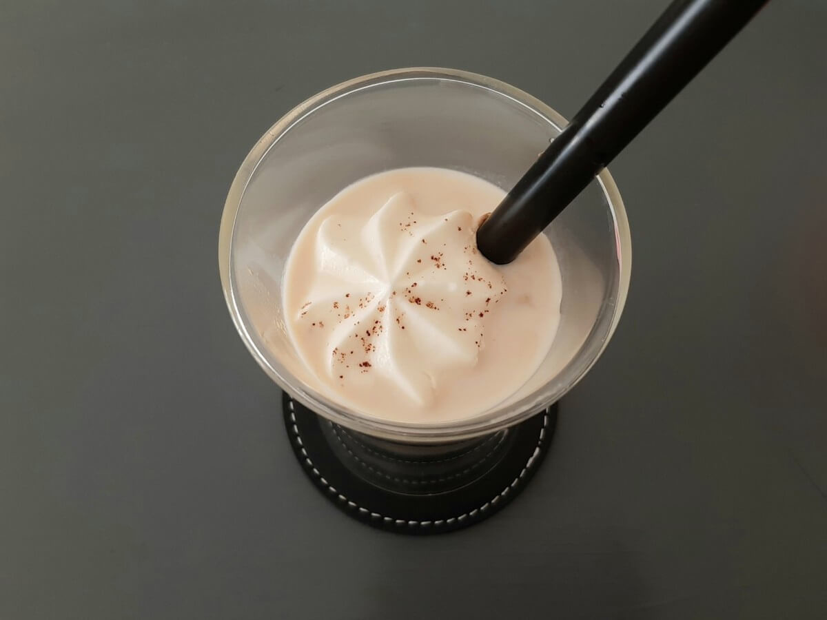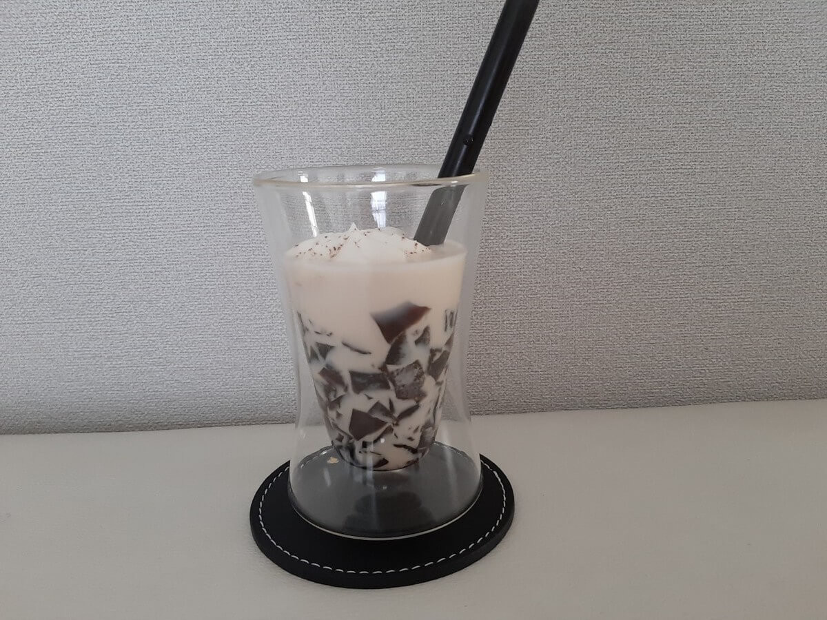 牛乳とゼリーをざっと混ぜたら、とっておいたホイップクリームをのせて完成です! 簡単なのにちょっとリッチな珈琲ドリンクができました。