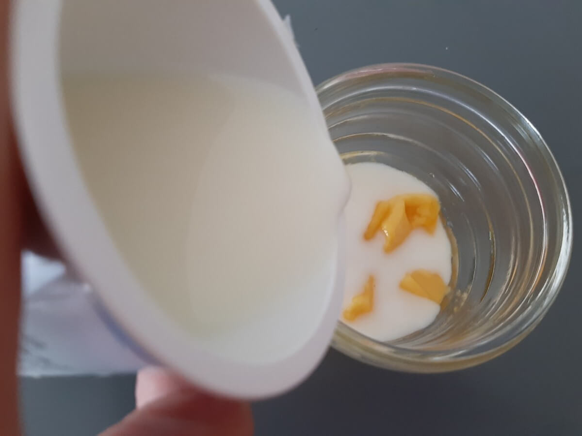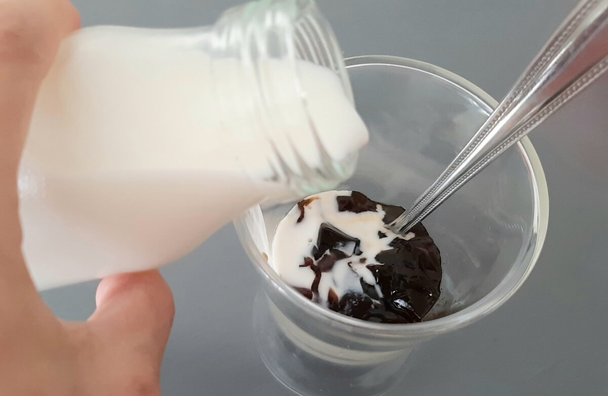 崩したゼリーに牛乳を注ぎます。量はお好みで調整しましょう。