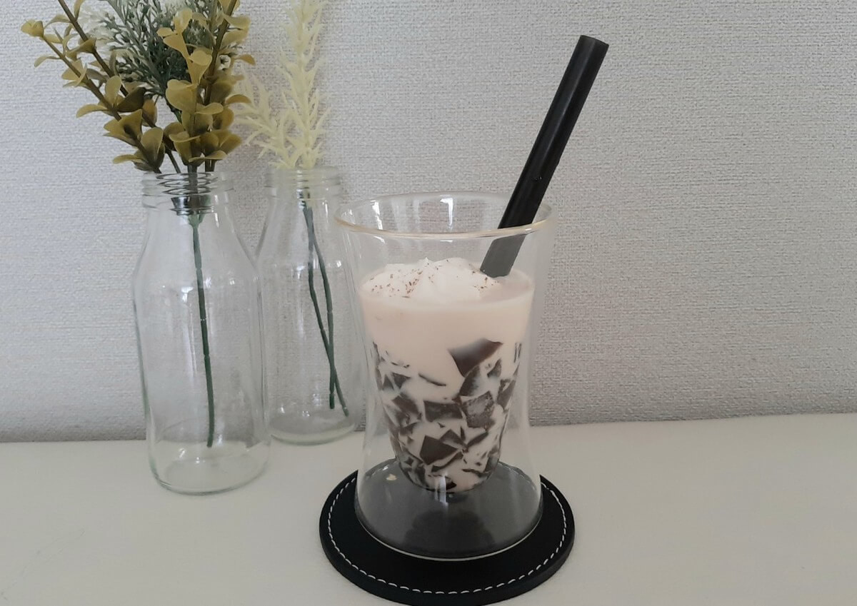 ほろ苦いゼリーが牛乳と混ざることでまろやかに。ホイップクリームを溶かすと甘さもUPします。 ゼリードリンクを楽しむために、太めのストローを使うのがポイントです。