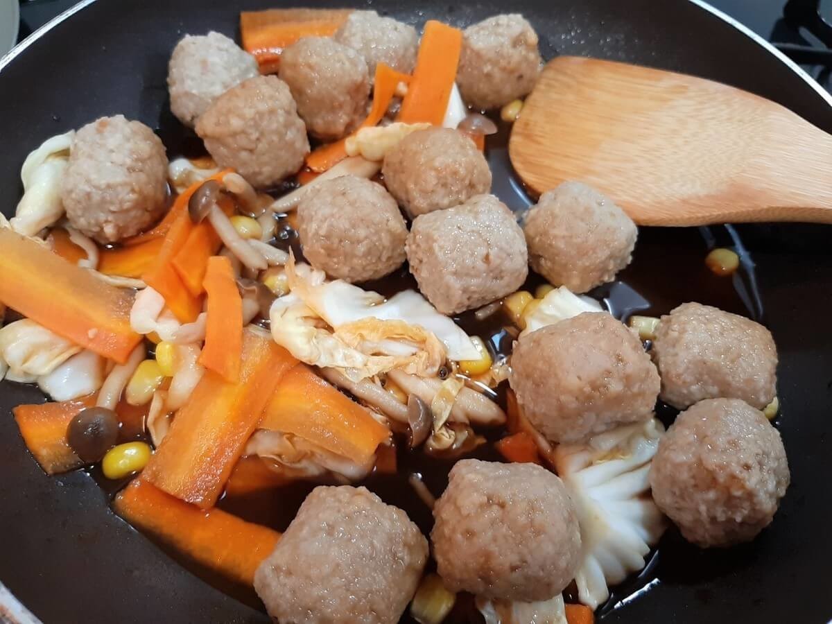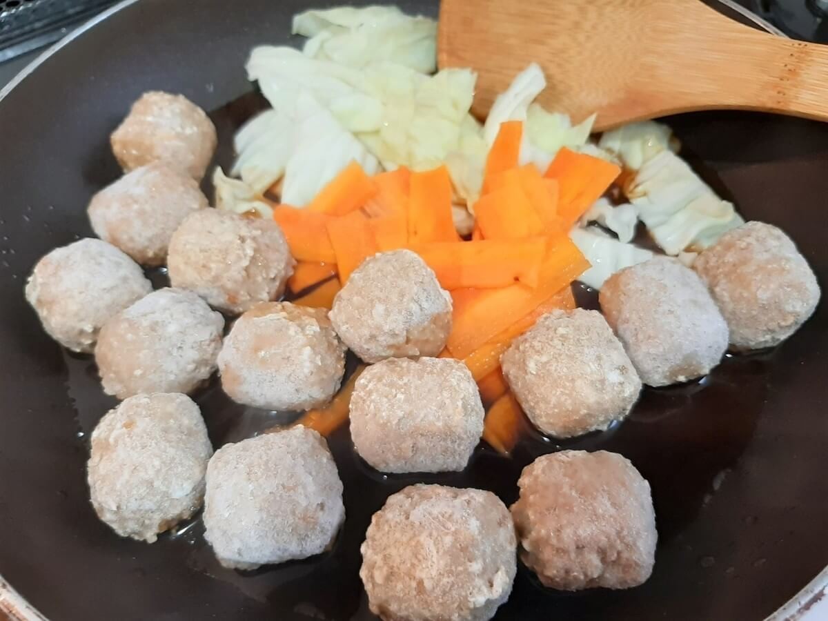 ①凍ったままの鶏だんご・野菜・調味料をフライパンにIN