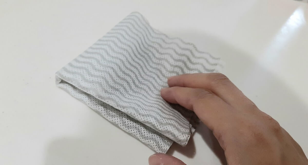一枚を3回折りました。軽く濡らして絞ったものでテーブルを拭きましょう。ティッシュのようにちぎれないので、少し力強く拭いても大丈夫です。