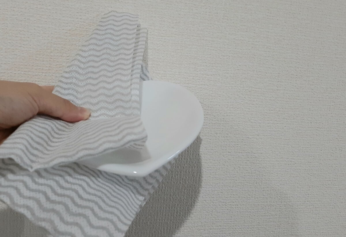 ペラペラなのに食器が拭けるの?と思いますよね。実は意外にも吸水性があるんです。 食器に布繊維がつきにくいところも気に入っています。