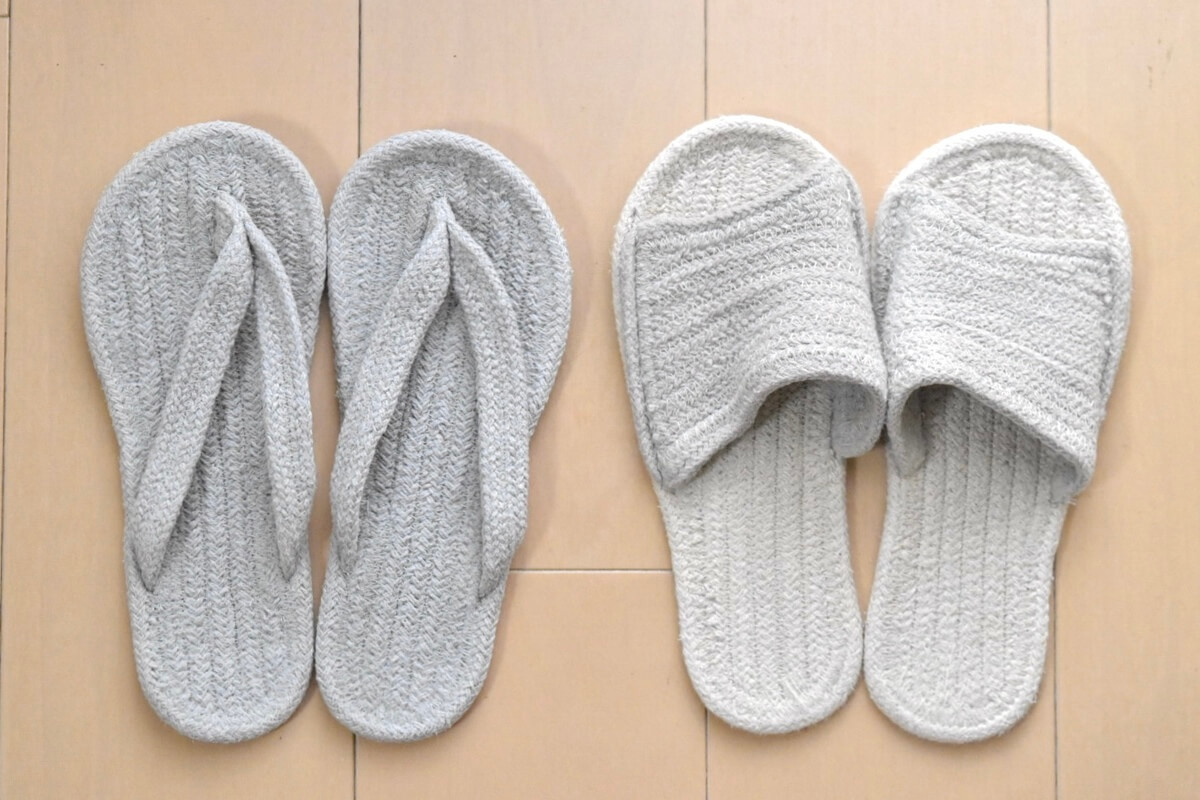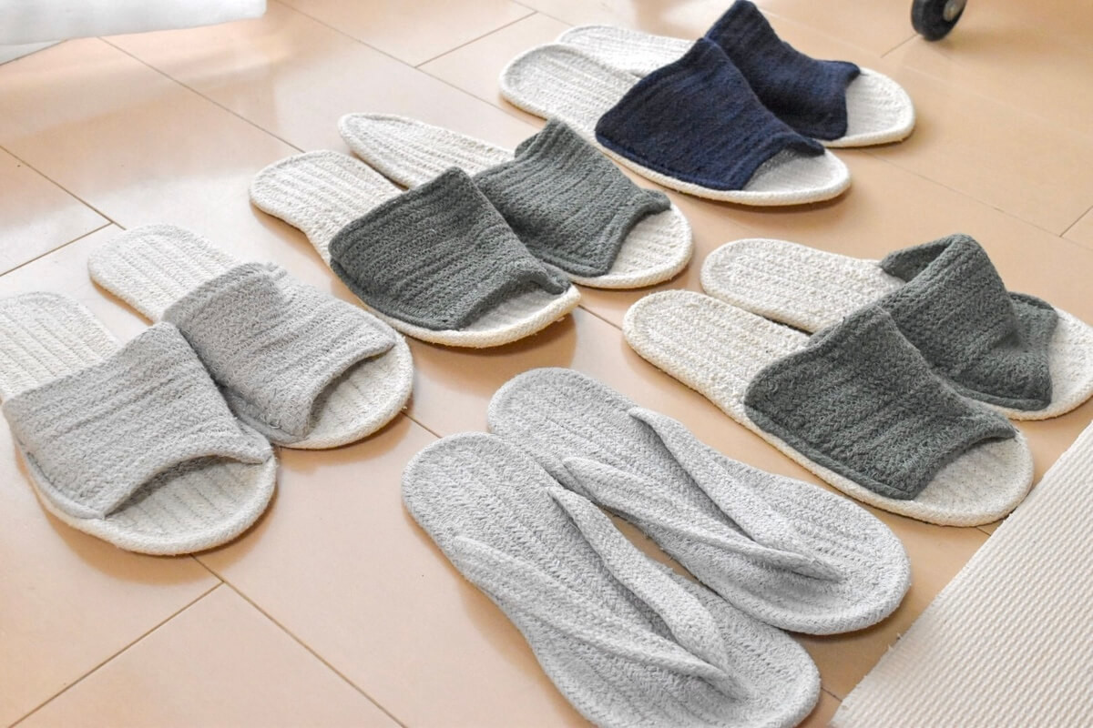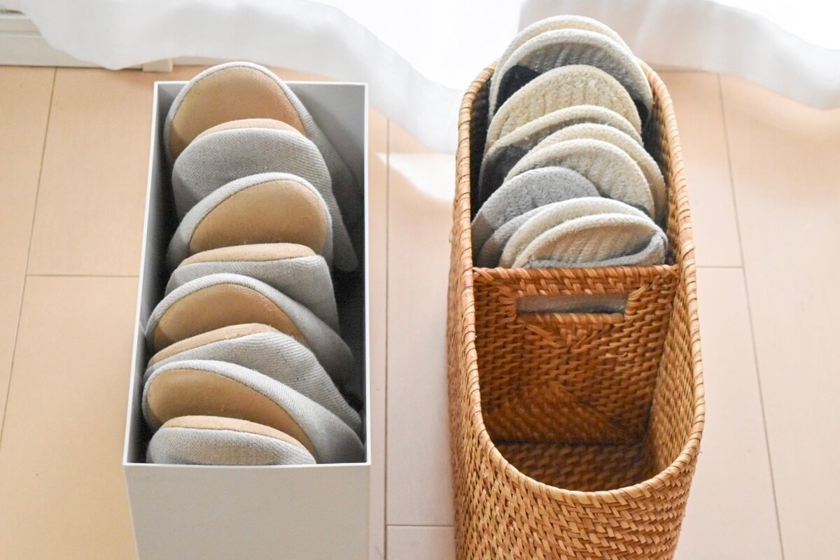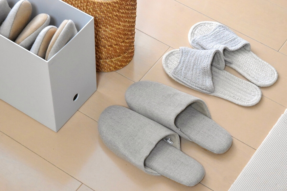 左側がソフトスリッパ4足、右側がインド綿ルームサンダル5足。 型崩れしにくいのでコンパクトに収納できます。