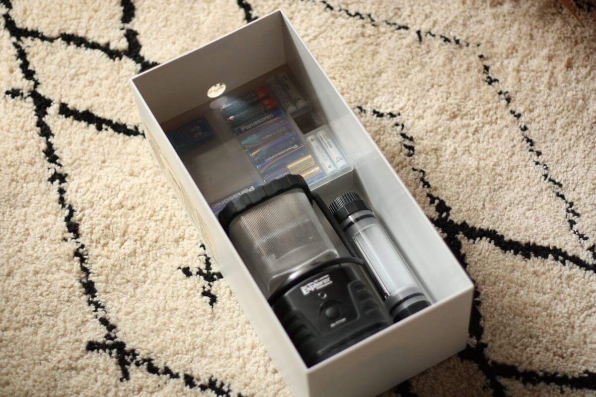ヘッドライトのおすすめは電池式。停電が長引いたときの充電切れを考えて、電池式を何個か準備しています。