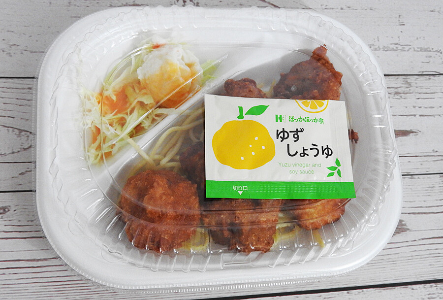 ほっかほっか亭「唐揚(5コ)おかず」を注文すると、もれなくゆずこしょうがついてきます。ほっかほっか亭のから揚げは何も付けずとも醤油系の味がしっかりと染みていて美味しいので、ゆずこしょうは味に変化を付けたくなった用として考えた方がいいかも。